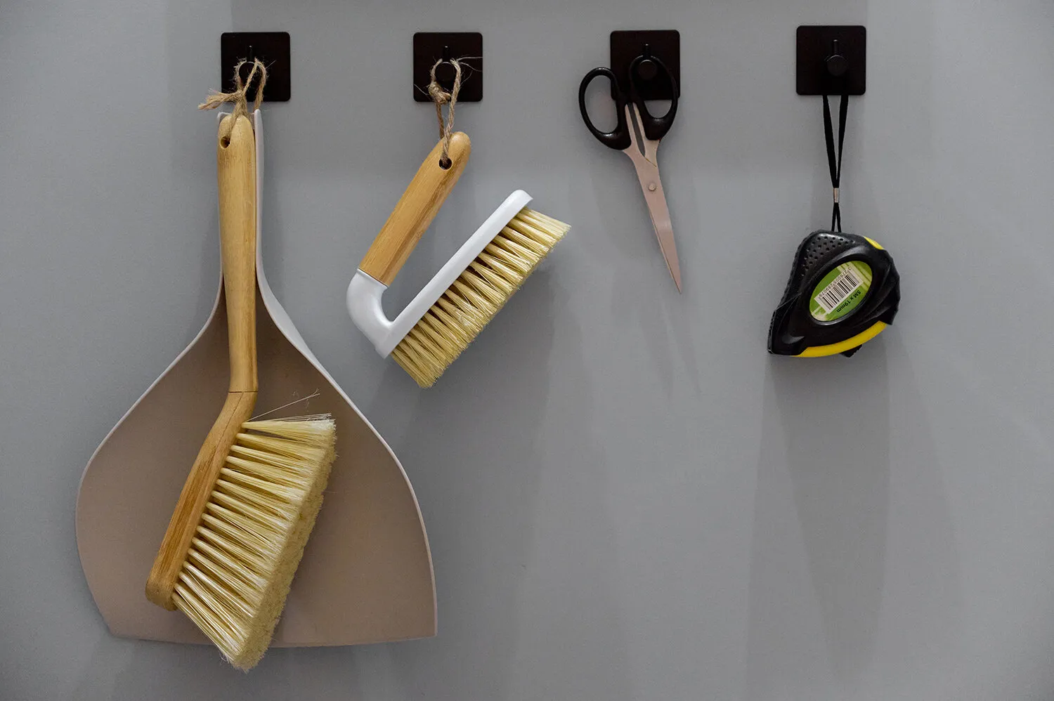 Nuestra heroína colocó especialmente a la vista las cosas más necesarias en casa (escoba, pala, cinta métrica). Lo importante es que estos artículos sean estéticamente atractivos, así pueden mostrarse a todos. Julia recomienda comprar artículos de limpieza hechos de madera en lugar de plástico colorido. No temas el almacenamiento abierto: siempre puedes usar cestas bonitas, y los artículos se pueden sacar y colocar fácilmente.