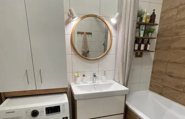 Detrás de las puertas correderas de espejo en la sala de estar se ocultó... un cuarto de servicios con una secadora, plancha y espacio adicional para almacenamiento. Los espejos están colocados frente a la ventana, reflejando la luz solar y llenando la vivienda con luz mientras visualmente amplían el espacio.