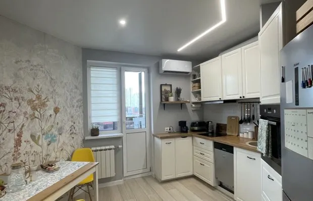 Me encanta el color. Los clientes temen usar tonos brillantes en los interiores, por eso en su propio apartamento se atrevió plenamente — en cada habitación hay acentos de colores intensos en la mobiliario o decoración. Sobre la cocina-comedorLa superficie combinada de la cocina y comedor es de 28 metros cuadrados. La zona de la cocina se definió por los pilares estructurales, alrededor de los cuales se construyeron las paredes. Entre ellos se colgó una viga, en la que se ocultó la ventilación de aire y se hizo una iluminación. El foco atrae el mirada al tablero de la cocina. A algunos le recuerda la atmósfera de una casa rural, a otros — la cabina de un barco. La forma del techo fue sugerida por el artesano encargado del trabajo de renovación. Para la decoración se utilizó una madera clara en forma de tablas, y los bordes se decoraron con una cuerda común.