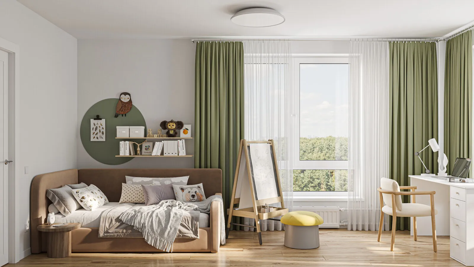 Al niño debe dársele su propio espacio personal. Si no hay posibilidad de equipar una habitación separada, se puede crear artificialmente un rincón aislado con divisores y técnicas decorativas de división espacial. Para el niño en edad preescolar se organiza un espacio amplio para juegos, para el estudiante se prepara un lugar de trabajo cómodo y una zona de descanso separada de otros miembros de la familia.