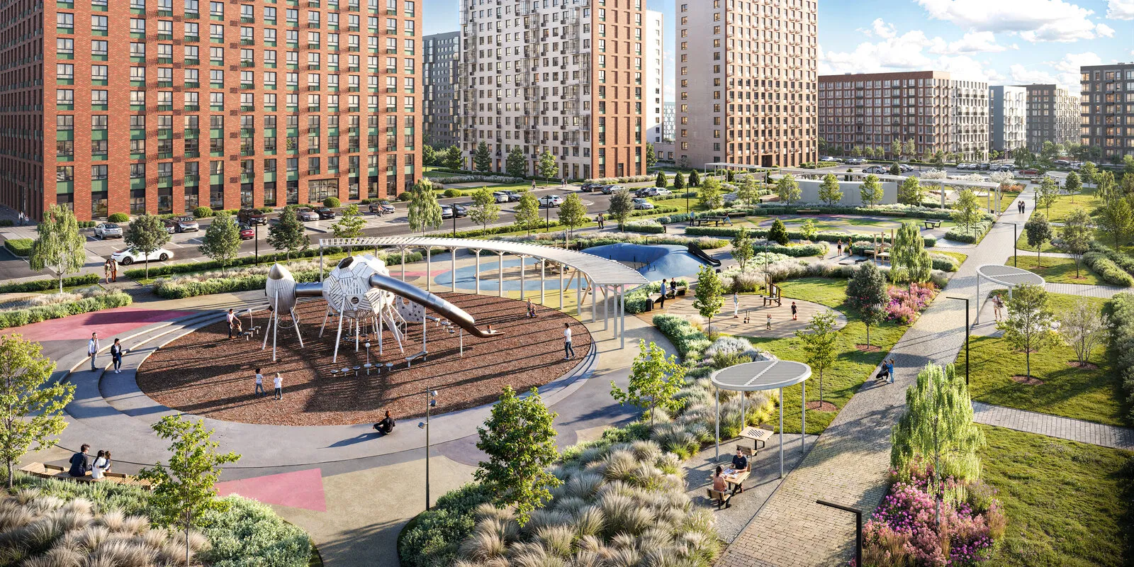 Todos los complejos residenciales del Grupo "Avión" están equipados con patios-parques seguros con paisajismo verde a distancia de los coches. En el área de cada complejo se han instalado zonas de descanso, áreas deportivas, espacios para entrenamientos y céspedes para yoga. Para cada zona se ha previsto su contenido funcional, y las áreas infantiles están equipadas con equipamiento de juego único hecho con materiales naturales.