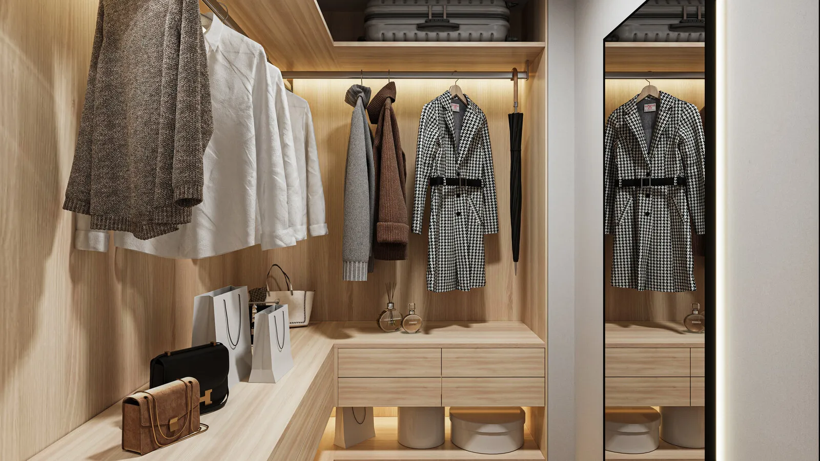 En esta solución de distribución espacial hay un espacio separado que cada uno puede usar a su gusto: como almacén o como guardarropa completo. Esta solución permite renunciar a los grandes armarios y organizar bonito el almacenamiento de cosas en un solo lugar.