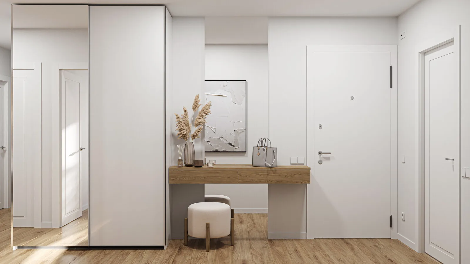 En el vestíbulo debe previstarse un lugar para ponerse la ropa y zapatos y para guardar bolsos o llaves. Es deseable usar armarios cerrados para no llenar el espacio con cosas. La madera desde el suelo hasta el techo con puertas espejadas ayudará a ampliar los límites del espacio y añadir funcionalidad.
