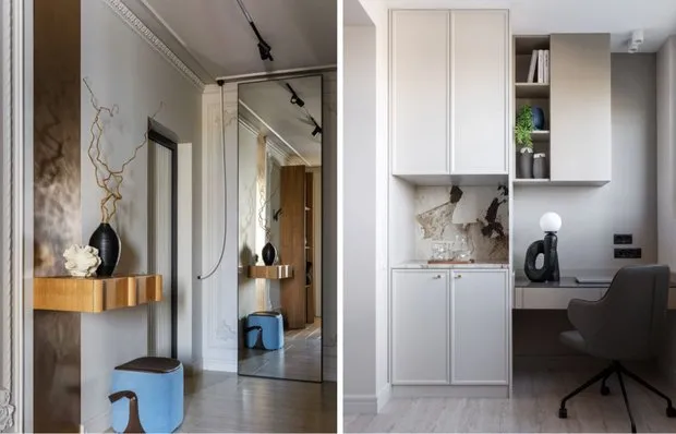 Almacenamiento eficienteLos diseñadores aprovecharon al máximo el espacio útil. Los armarios actúan como separación entre la zona de descanso y el vestíbulo, y también para guardar cosas. Las estanterías colgantes sobre la cama, el estante, la barra con compartimentos y las mesitas junto a la cama ofrecen más opciones de almacenamiento.