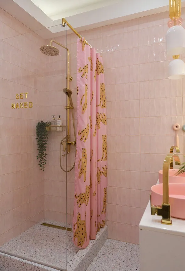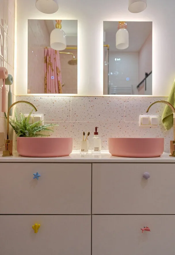Yulia siempre quiso experimentar con colores, por lo que el baño se convirtió en la habitación más colorida. La decoración rosa y el diseño audaz hacen que el interior sea único.