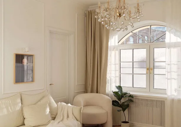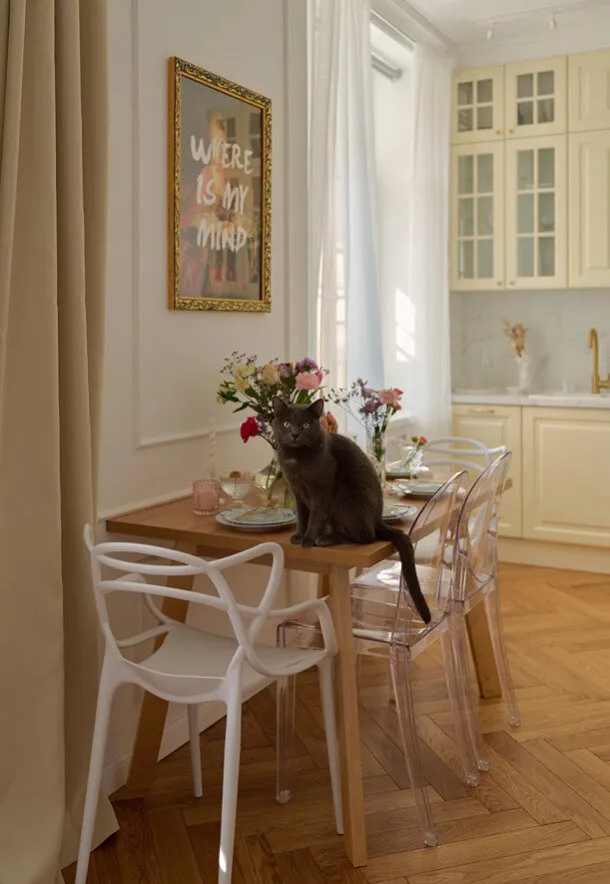 La dueña de este apartamento, Yulia, se interesa por el decorado y diseño. Juntos con su esposo soñaban con vivir en el centro de San Petersburgo y buscaban vivienda en el viejo stock. Al ver en el anuncio una ventana arquitectónica, Yulia entendió inmediatamente que era la opción ideal.