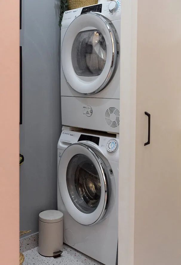 La zona de lavanderíaEn el baño se reservaron dos metros cuadrados para la zona de lavandería. Allí se colocaron la lavadora y la secadora en columna, y toda la química doméstica se organizó en estanterías prácticas.
