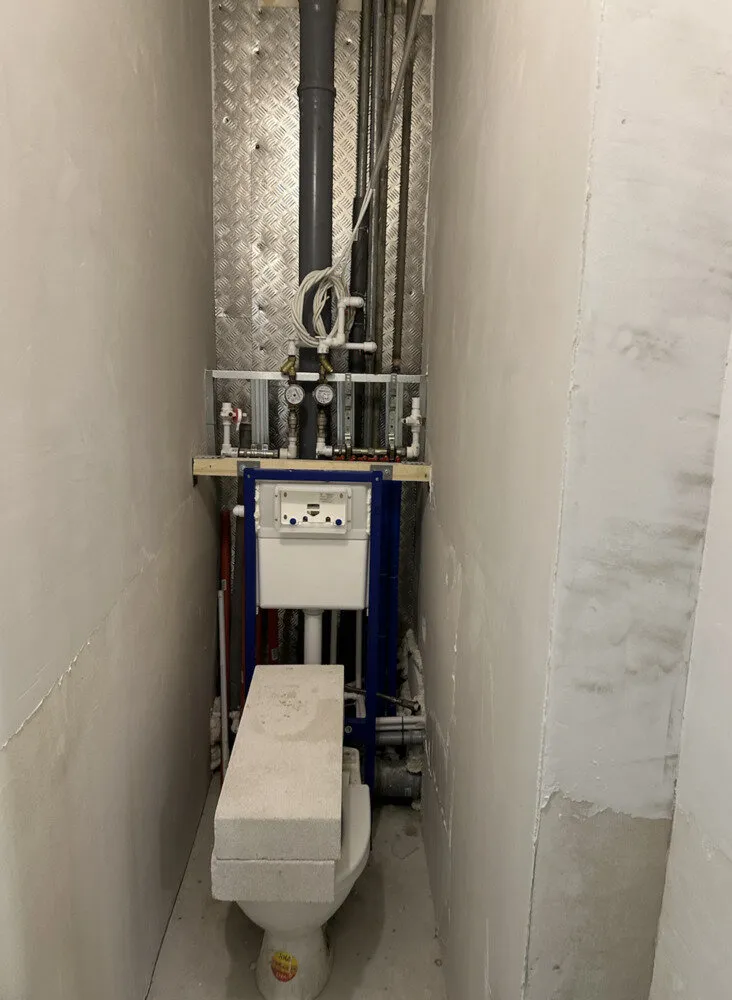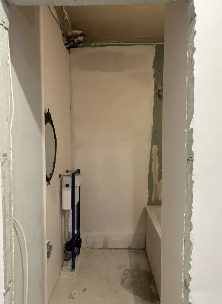 Los baños en edificios estándar siempre son un compromiso. Cada centímetro importa: si no se consideran las dimensiones de los accesorios sanitarios, el espacio deja de funcionar. Elegimos el camino inteligente: compramos la instalación y el asiento del inodoro por separado para elegir las dimensiones más compactas. Como resultado ganamos casi 10 cm y logramos colocar el lavabo incluso en el baño invitado.
