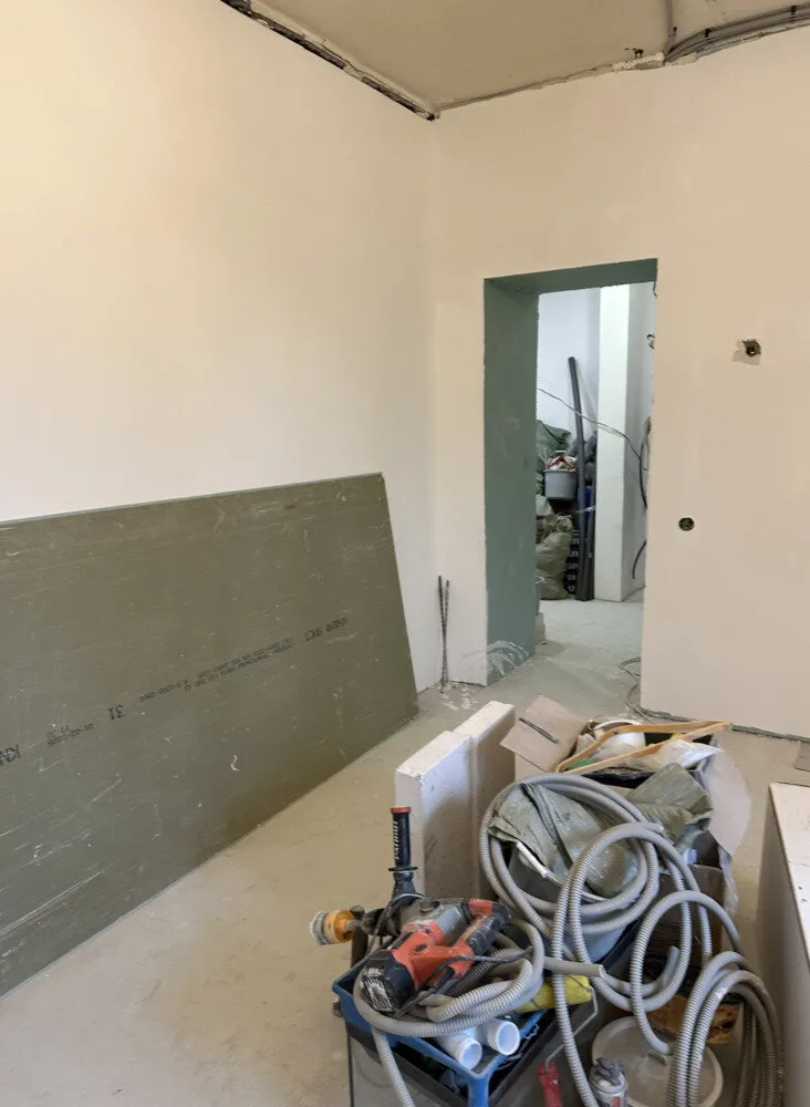 En el baño principal seguimos adelante: elegimos un lavabo de solo 30 cm de profundidad, pero largo para que sea cómodo usarlo. Todo está alineado con ejes, sin desplazamientos ni ángulos rectos — el resultado se verá limpio y será fácil de usar. Estas soluciones son fáciles de ahorrar en la etapa de planificación, pero casi imposibles de corregir después de colocar el azulejo. Por eso todo lo planificamos cuidadosamente hasta el milímetro.