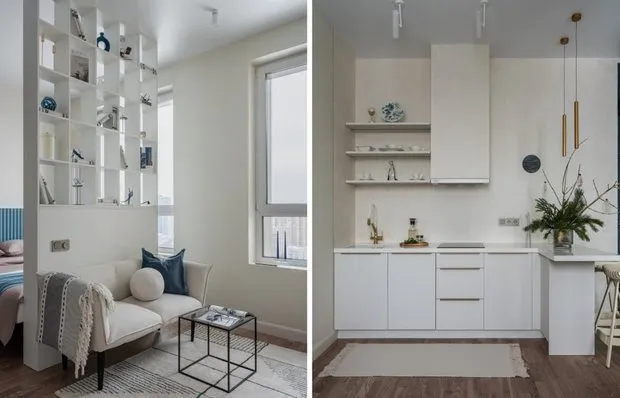 La diseñadora Liana Khashchanova trabajó en un apartamento de 55 m² en una nueva construcción en Kazán. La principal tarea era planificar una cocina-sala de estar y una habitación con armario para una pareja casada. La pared detrás del sofá está decorada con moldes clásicos que añaden profundidad y gráfica sin causar ruido visual. Esto se ve especialmente expresivo en interiores monocromáticos claros: no es necesario recurrir a acentos brillantes y al mismo tiempo se puede crear una textura interesante.