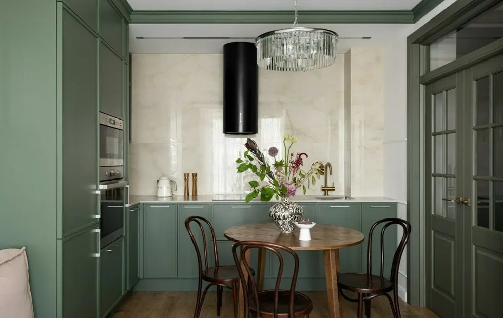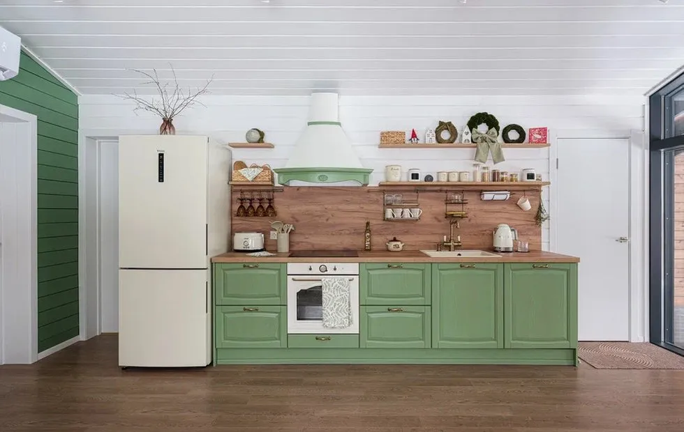 El conjunto de cocina está hecho a medida y combina dos tonos: la madera clara y el verde pastel. No solo es estético, sino también práctico: las puertas son fáciles de limpiar y los tonos no molestan los ojos incluso con una luz solar intensa.
