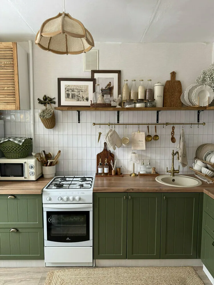 Cómo decorar una cocina brillante con delantal de esmeralda en una habitación tipo 69 m²