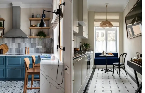 Cómo un diseñador decoró genial una cocina de forma irregular en un apartamento de 36 m²