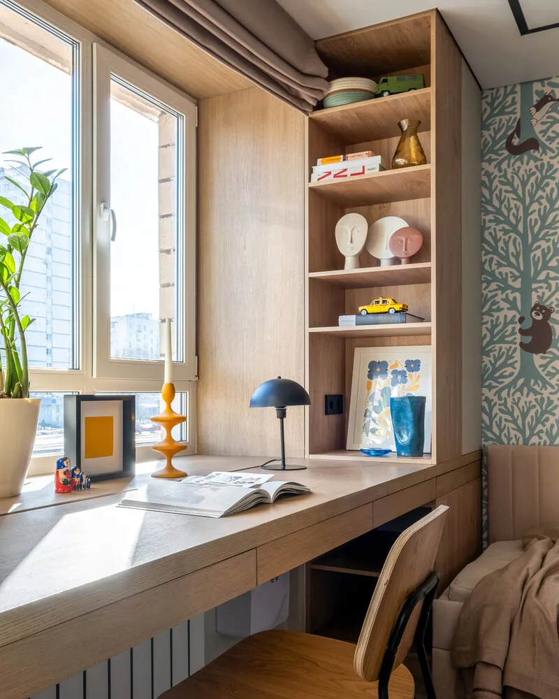 Las estanterías colocadas a ambos lados de la ventana en la habitación del niño no solo sirven para almacenar, sino también como decoración del espacio. Pueden usarse para guardar libros, libros de texto, juguetes, plantas y accesorios.