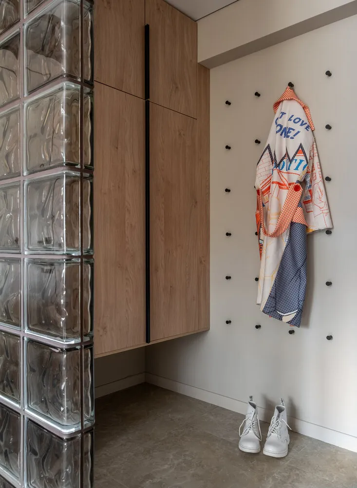 En el vestíbulo hay ganchos para ropa colgada en diferentes alturas, adaptados al crecimiento infantil. Esta solución ayuda a liberar espacio en el armario para otras prendas y hace que el vestíbulo sea más organizado y cómodo.