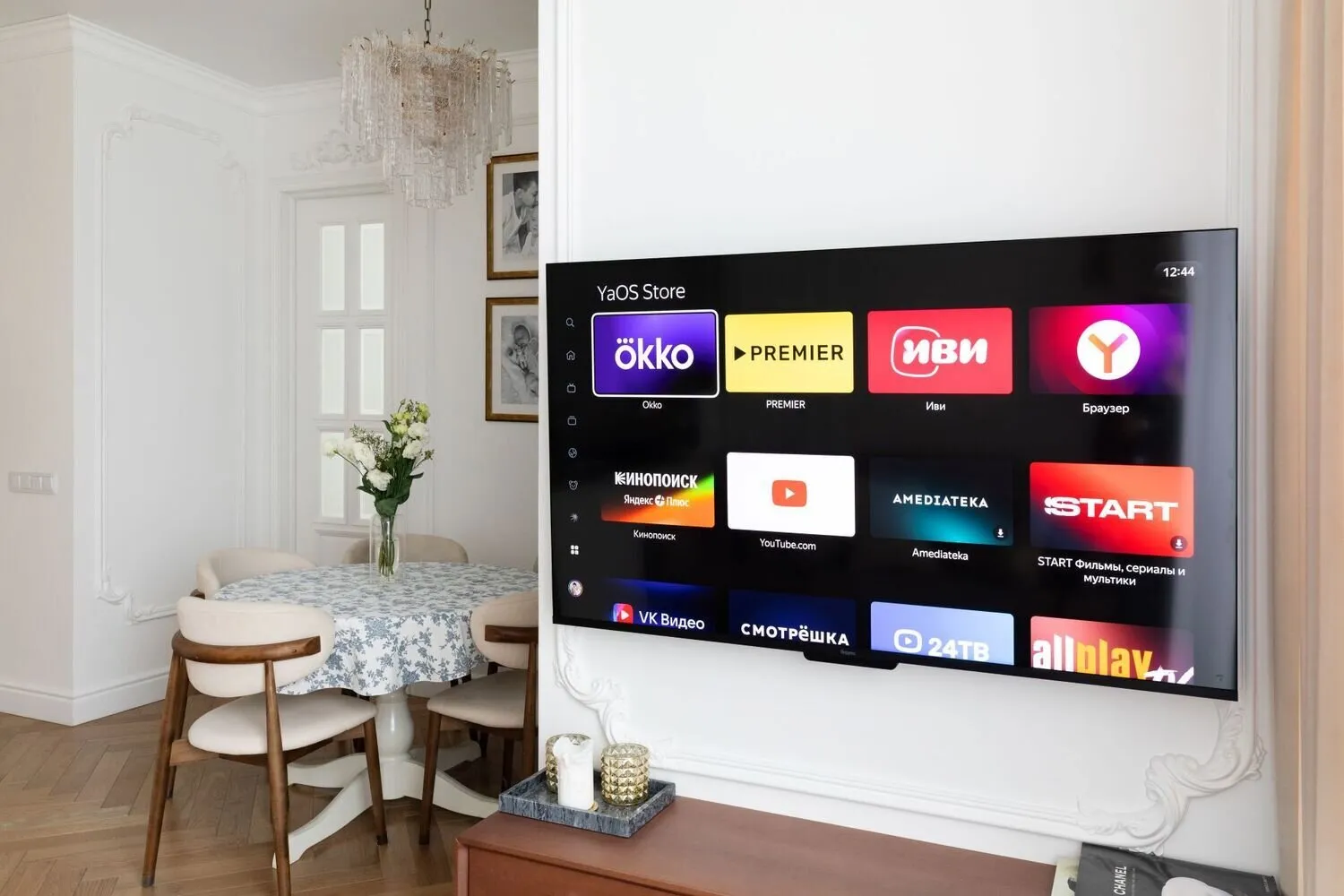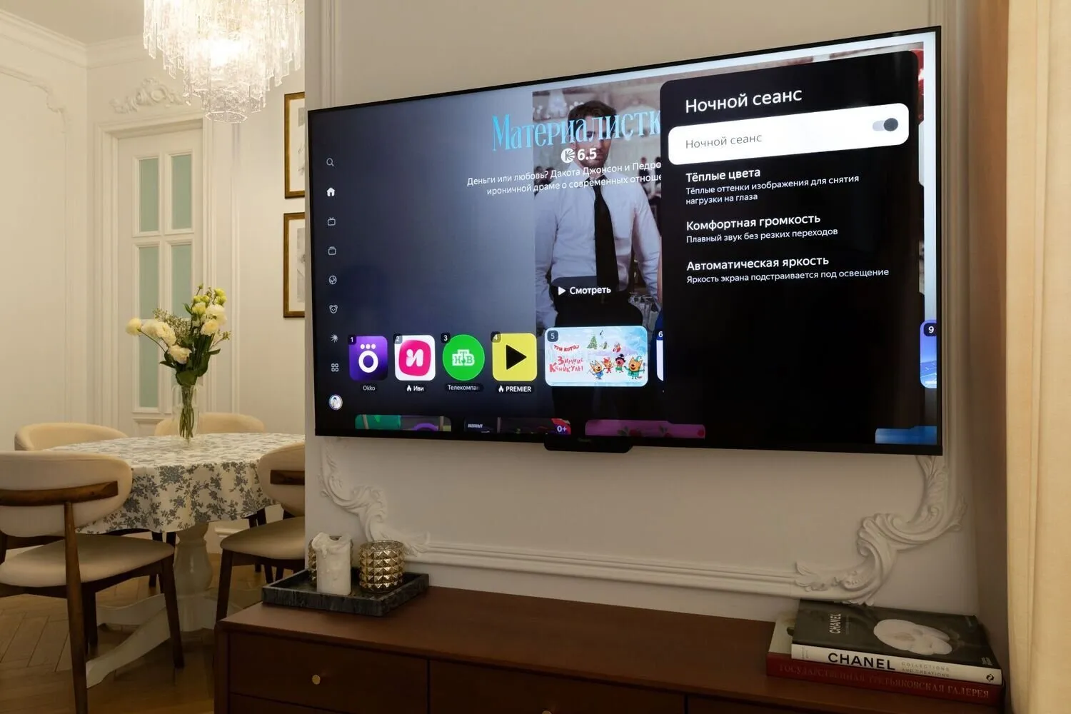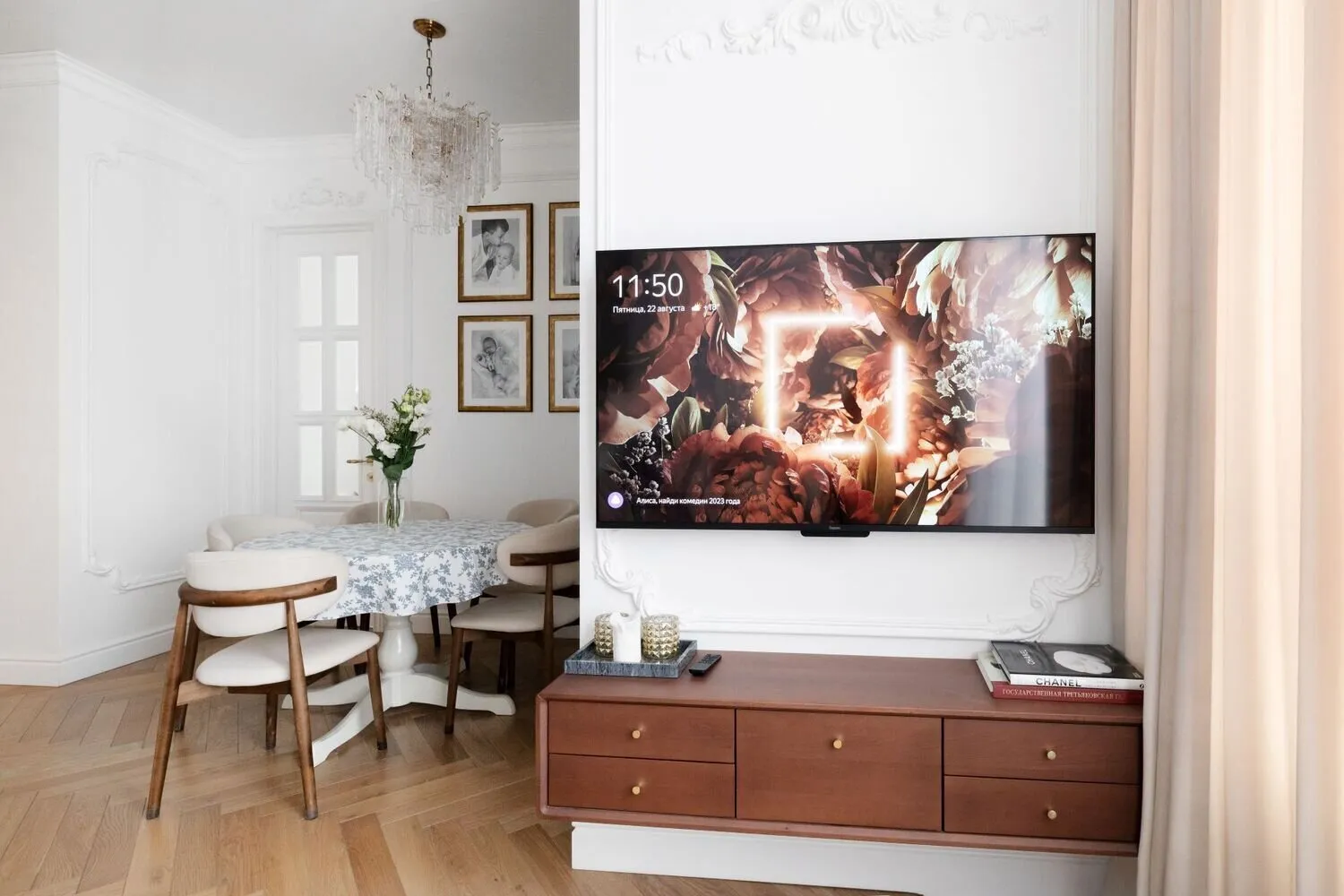 En la zona del salón se ha instalado un cómodo sofá, frente a él una zona de TV. La elección del televisor no fue casual ni espontánea. Fue un paso lógico para crear un espacio cómodo en el salón que se convirtió en el centro de la comunicación familiar. Nadia eligió la Estación Pro MiniLED con Asistente Alisa de Yandex. Las especificaciones técnicas de este modelo inspiraron confianza, pero la característica principal fue sin duda su sistema inteligente.