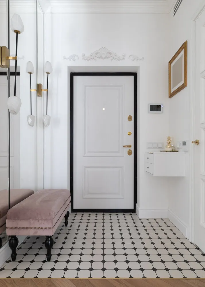 El vestíbulo recibe a los invitados con azulejos en blanco y negro, mientras que el gran vestidor del lado derecho permite almacenar todas las prendas sin desorden.