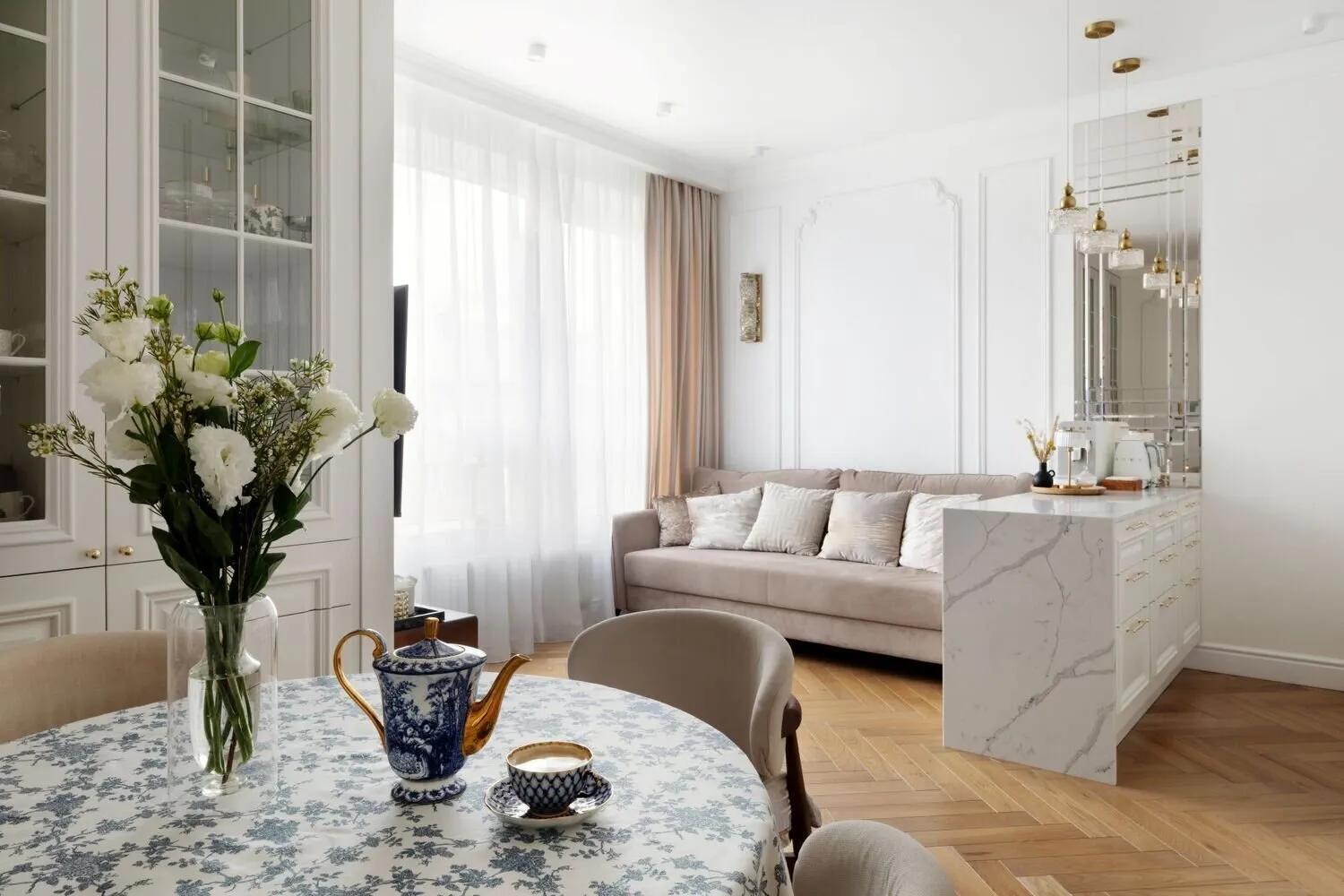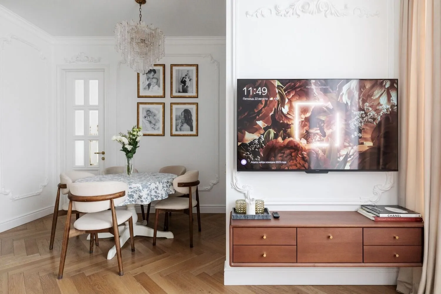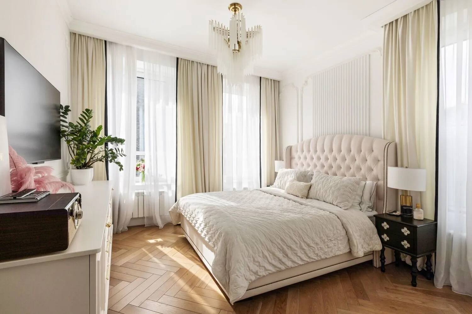 En el suelo se colocó una tabla de ingeniería con el patrón de una navidad inglesa. Caminar descalzo sobre este tipo de suelo es un verdadero placer. Las paredes están pintadas con una pintura clara y decoradas con molduras. Las puertas altas, que alcanzan los 2,90 metros, resaltan el estilo del interior y transmiten una sensación de amplitud.