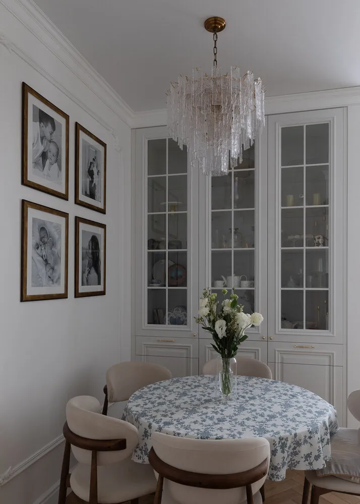 El lugar favorito de toda la familia es la cocina-comedor. Nadia diseñó por sí misma el diseño de la cocina y el mueble modular y lo encargó según sus bocetos. El sistema de cocina lineal incluye puertas con paneles que se relacionan con las molduras en las paredes. El mostrador bar divide el espacio y lo hace más acogedor.