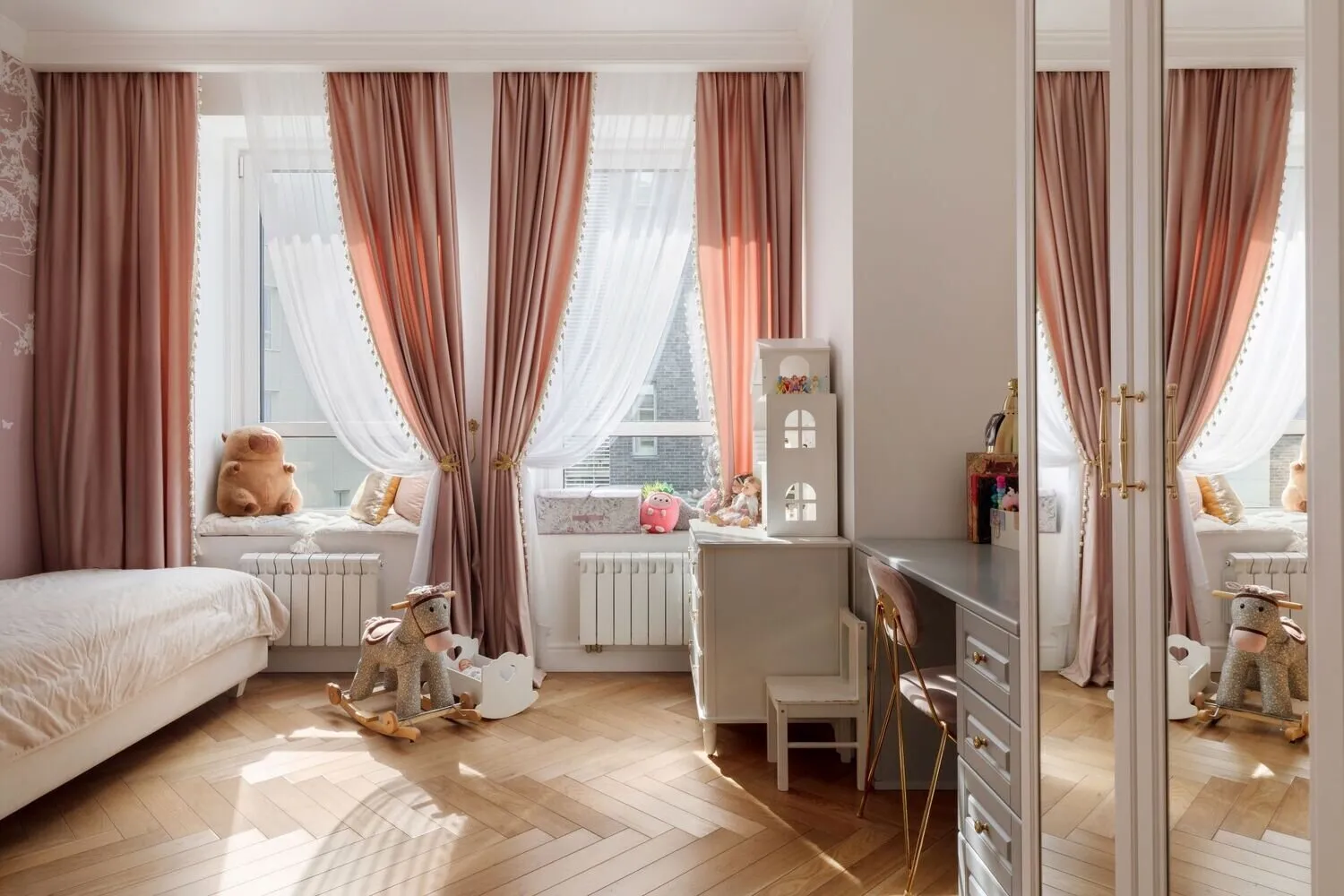 La habitación de las niñas está decorada con tonos suaves rosados. Aquí hay dos camas, un gran escritorio y espacios de almacenamiento. Para el hijo se creó un espacio acogedor con cama, sofá y escritorio. Todo es simple: se puede trabajar con productividad y descansar cómodamente.