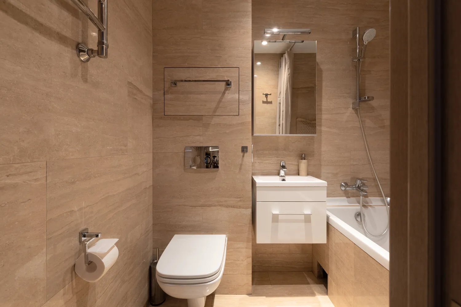 Sobre el bañoPara decorar el baño elegimos cerámica de granito con acabado de madera tanto en las paredes como en el suelo. Instalamos una bañera completa y eso resultó muy útil, especialmente con un niño. El inodoro colgado y la alacena del lavabo también fueron buenas decisiones, ya que bajo la alacena cabía una canasta para ropa. Por encima del lavabo colocamos un armario funcional con espejo.