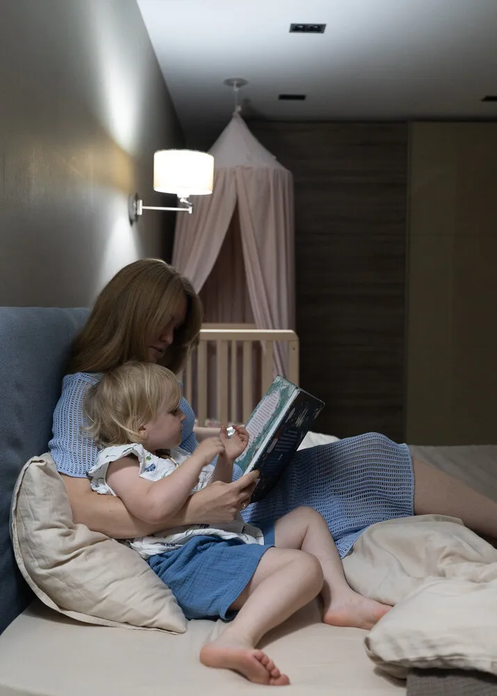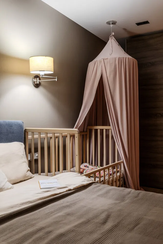 Actualmente en la habitación principal hay una cama infantil, por lo que tuvimos que planificar la iluminación. Instalamos un brazo con bombillas inteligentes de Yandex. En ellas se pueden configurar escenas de encendido donde la intensidad y temperatura de luz cambian automáticamente. Por ejemplo, configuramos una escena para dormir: por la noche la luz se atenúa lentamente para preparar al niño para dormir, y por la mañana las bombillas se encienden progresivamente permitiendo despertar con comodidad.