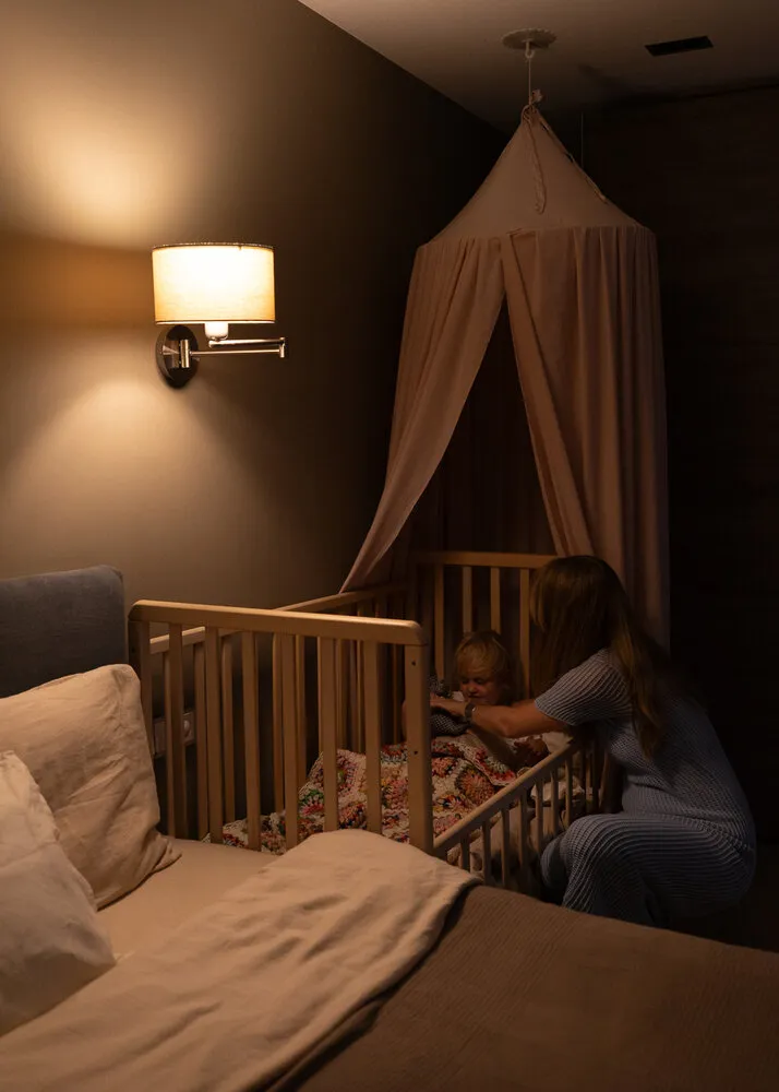 Existe también un modo nocturno: si alguien se mueve en la oscuridad, el sensor de movimiento lo detecta y enciende una luz suave en el brazo que se apaga después de unos minutos. Así, al niño no le da miedo levantarse por la noche y la luz no molesta a quienes duermen. El modo nocturno puede activarse mediante la aplicación cuando todos ya están dormidos. Ahora puedo controlar la luz desde la cama sin tener que levantarme del interruptor.