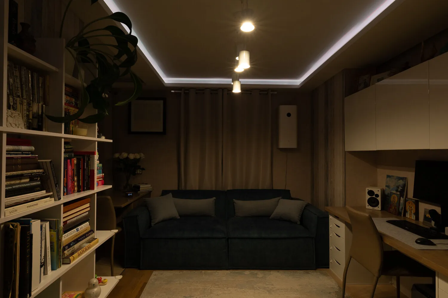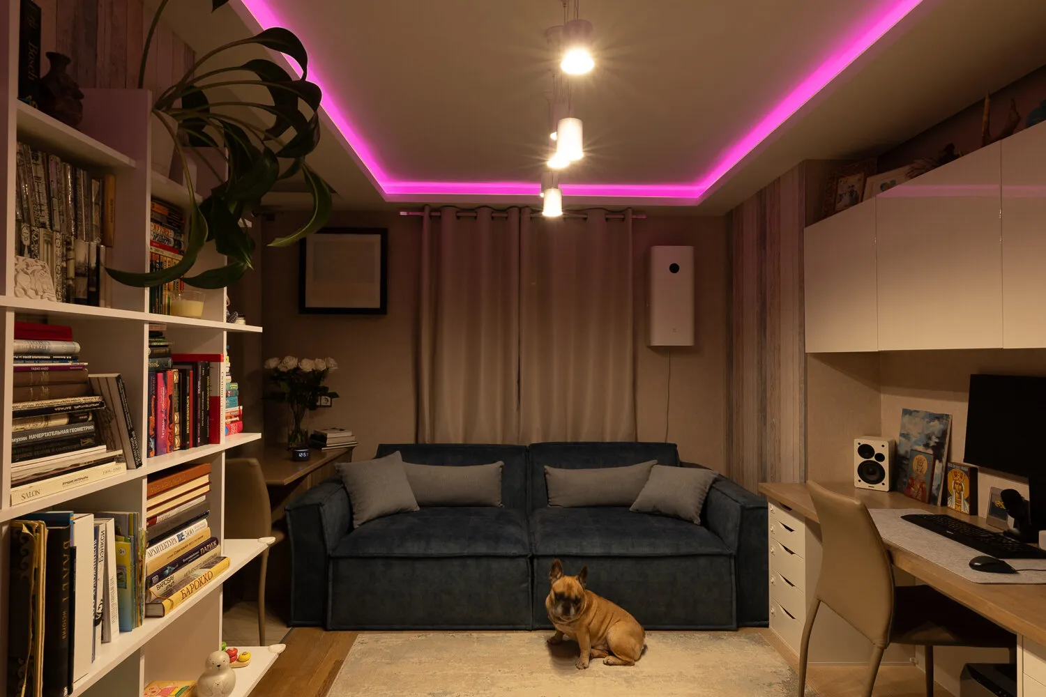 En la sala de estar colocamos una cinta LED, bombillas inteligentes para la lámpara colgante y una lámpara de escritorio. Esto es conveniente: se puede ajustar la intensidad según la hora del día — más brillante durante el día y por la noche, atenuada para descansar o ver películas. Por la noche encendemos la lámpara colgante y la lámpara de escritorio al 30% de brillo, y para crear ambiente — una iluminación rosada proveniente de la cinta. De esta manera, creamos acentos decorativos con iluminación.