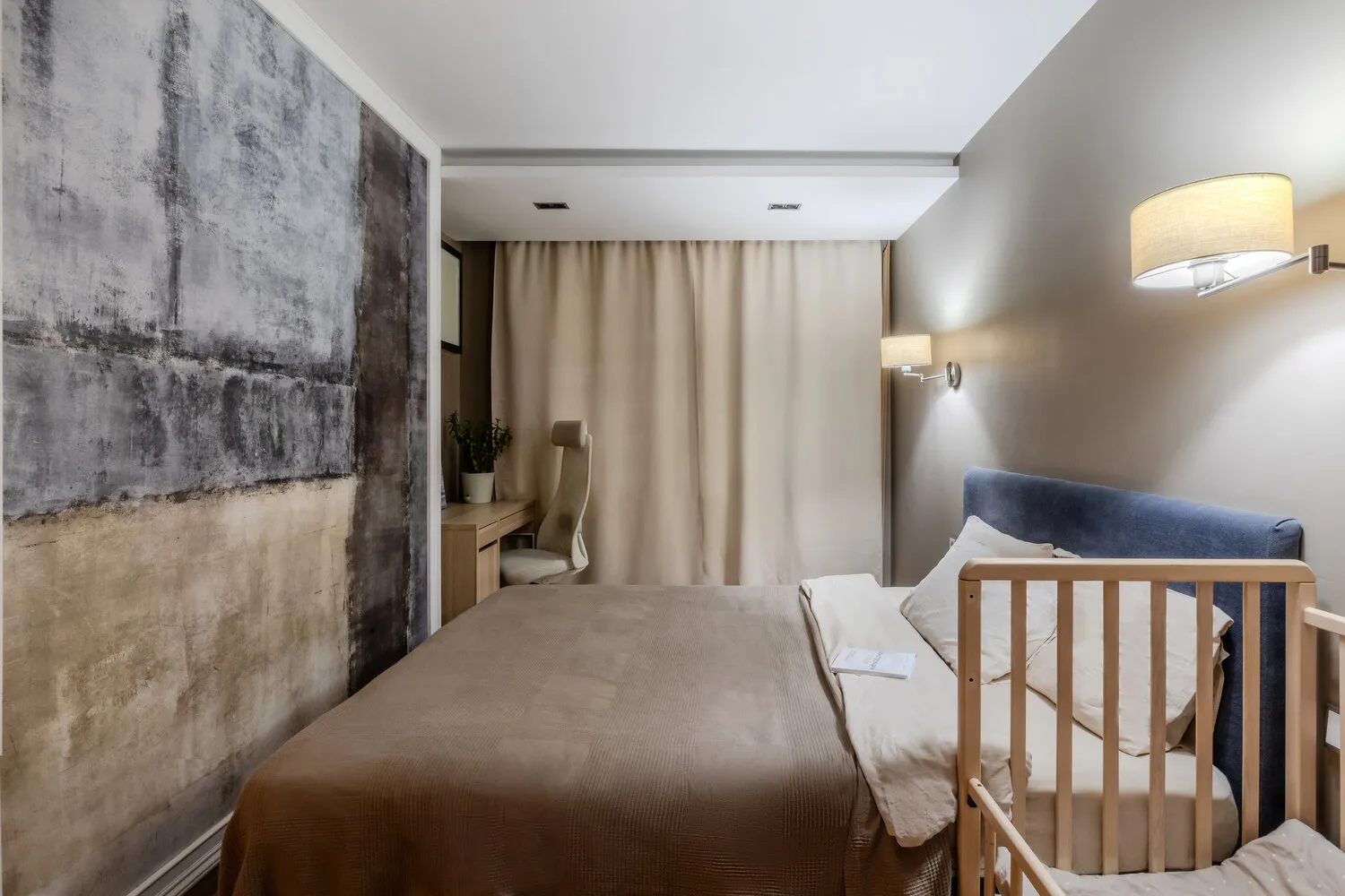 La pared de la habitación principal sobresale debido a una nicho en la sala de estar. El paso es bastante angosto — solo 40 cm, aunque sabíamos que un paso cómodo normal sería de 80 a 90 cm. Tomamos el riesgo, pero encontramos una solución: compramos una cama estrecha sin sobresalientes, con diseño suave y bordes redondeados. El cabecero lo hicimos nosotros mismos con madera, espuma y tela — quedó fino y elegante. Al final incluso con esa estrecha anchura nos sentimos cómodos.