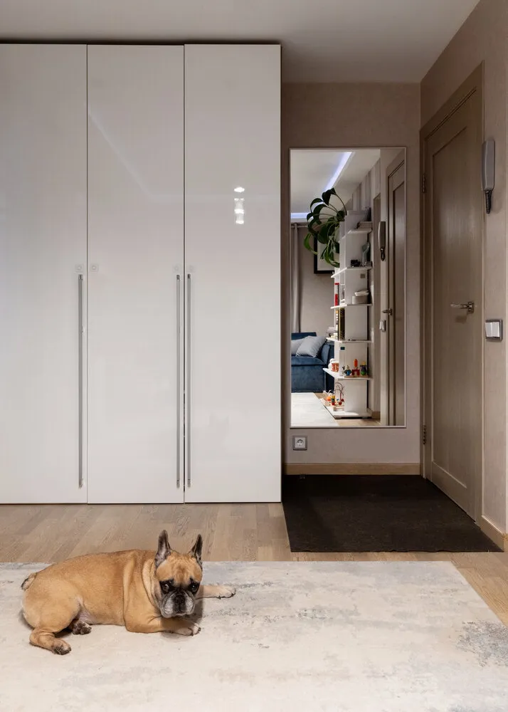 Sobre la distribución y el remodeladoEn el momento de la compra, el apartamento parecía bastante típico: una cocina pequeña, dos habitaciones — una de ellas era realmente diminuta, solo 7 metros cuadrados, y una entrada pequeña. Para hacer el espacio más conveniente, se retiraron algunas particiones y se combinó la cocina con la sala de estar. Se añadieron nichos para instalación de electrodomésticos integrados, con el fin de que todo se vea ordenado. Con el nuevo diseño, la vivienda dispone ahora de una cocina-sala de estar espaciosa, habitación principal, entrada y baño. Se reservó un área frente al baño para colocar la lavadora y almacenamiento.