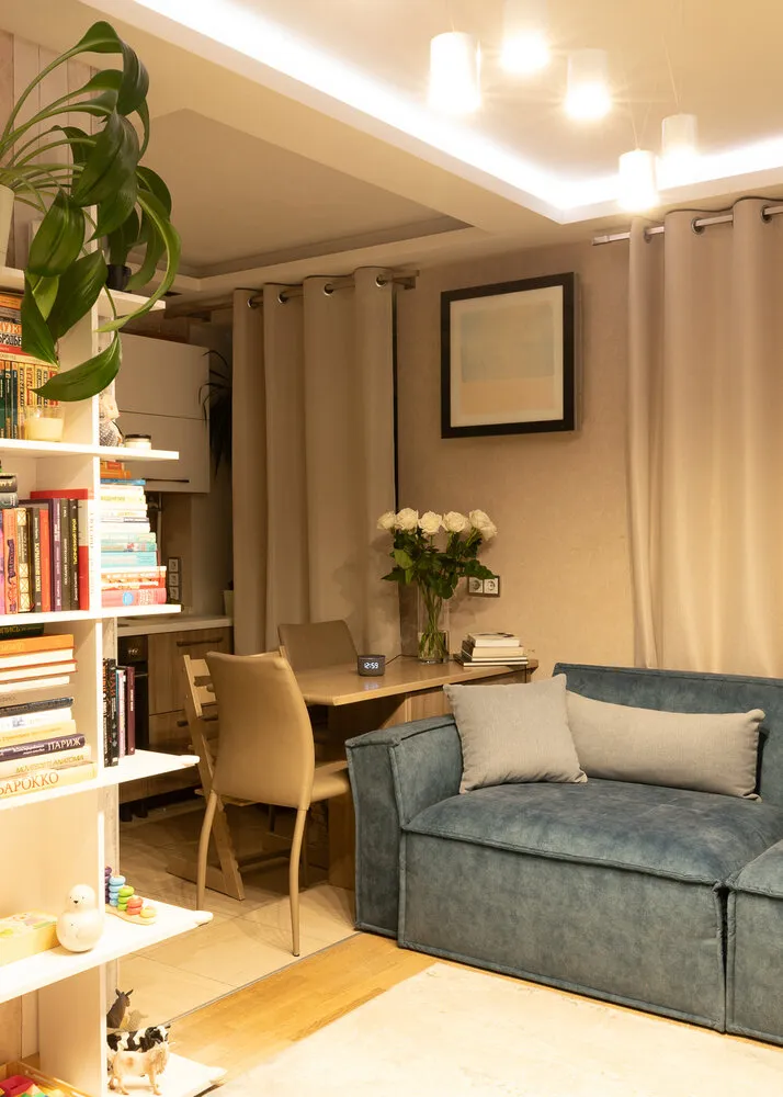 La vivienda originalmente se diseñó para dos personas: Elizabet y su esposo. Con el tiempo, muchas cosas cambiaron: en la familia apareció un hijo y un perro, y el trabajo ahora se realiza desde casa en lugar de los anteriores locales oficina. El interior de la vivienda se actualiza poco a poco, y recientemente la pareja mejoró la iluminación para hacer el ambiente aún más cómodo.