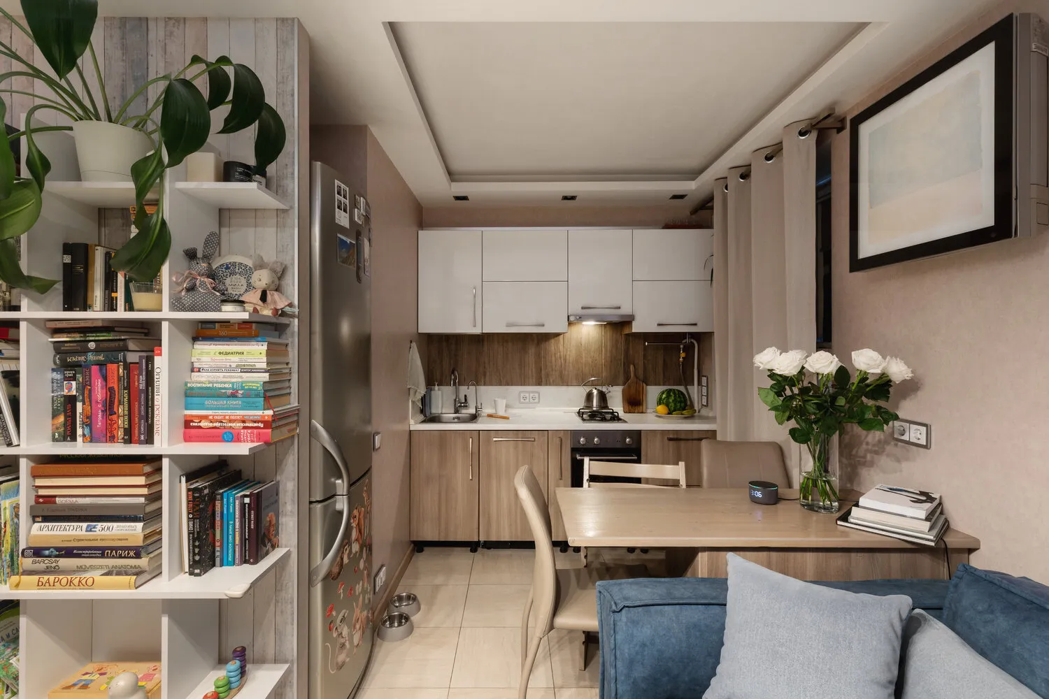 El interior, por supuesto, cambia con nosotros y se adapta a nuestras necesidades. Por ejemplo, cambiamos el sofá por uno más cómodo con memoria. En la cocina había inicialmente una barra alta, pero al aparecer el niño tuvimos que hacerla más baja para facilitar el acceso.