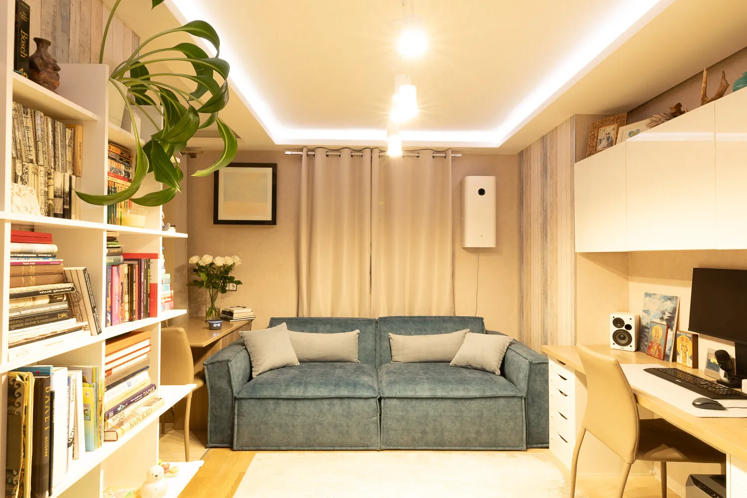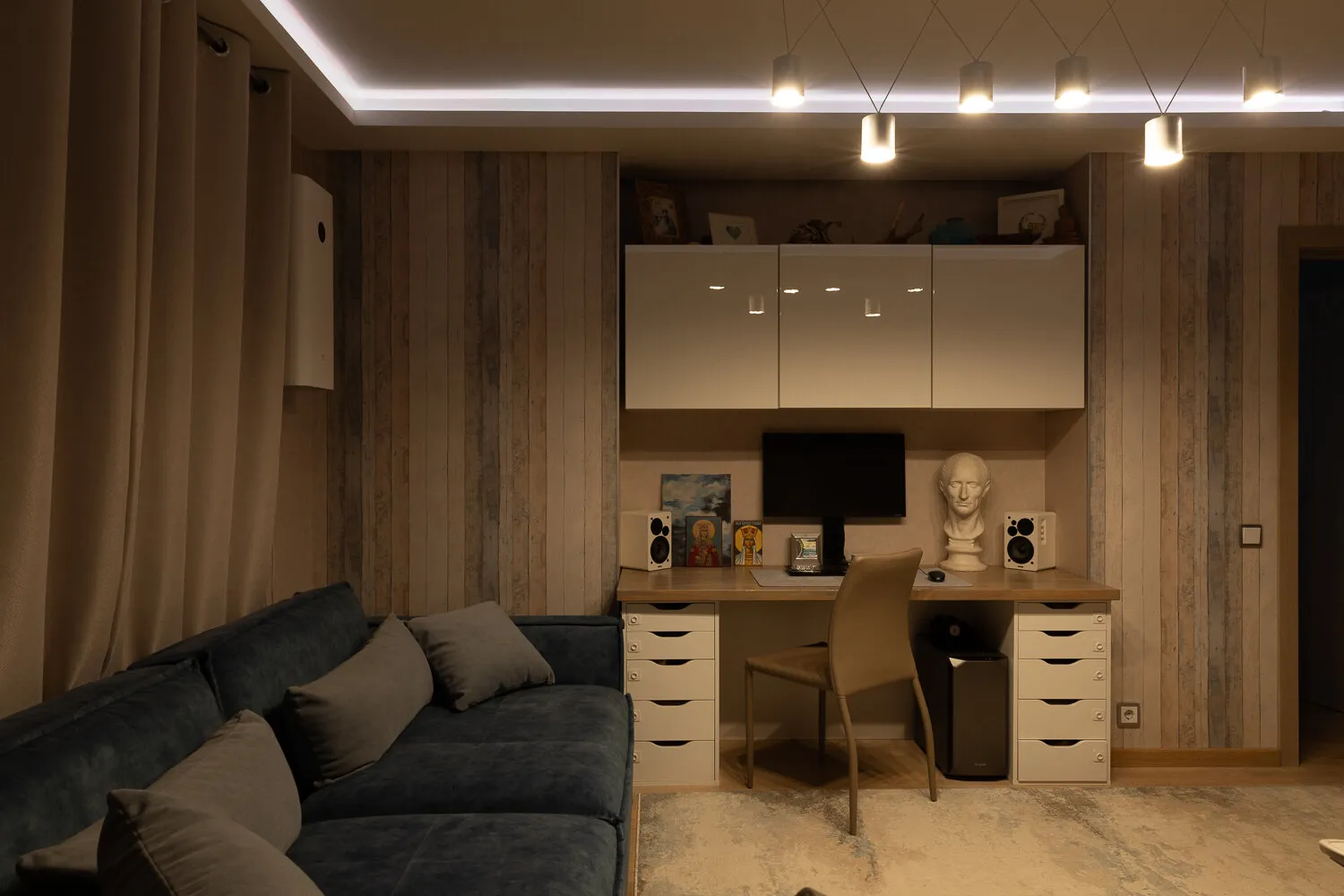 Queríamos adaptar no solo la mobiliario, sino también la iluminación. Resultó que se pueden añadir dispositivos inteligentes de Yandex en cualquier momento, no solo en la etapa de planificación del remodo. Recientemente instalamos bombillas inteligentes y sensores controlados por voz a través de la Estación Yandex y la aplicación Dom inteligente con Alice.