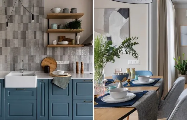 Se retiró la puerta de la cocina, permitiendo así crear un espacio más abierto. La paleta de colores principal se basó en tonos que reflejan el código cultural de Kaliningrado: terracota, simbolizando los techos de edificios históricos, y azul, representando las aguas del Mar Báltico. Estos colores aportan vitalidad y generan una atmósfera cálida y acogedora a la cocina.