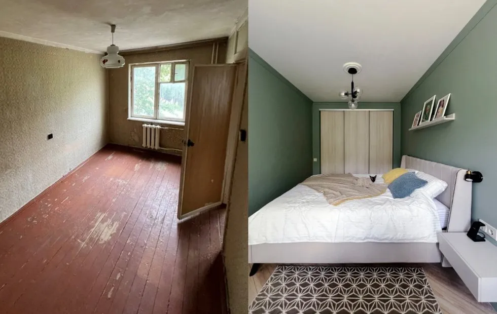 Apliqué de la era Khrushchev: dormitorio con área de trabajo y guardarropa sin pérdida de espacio