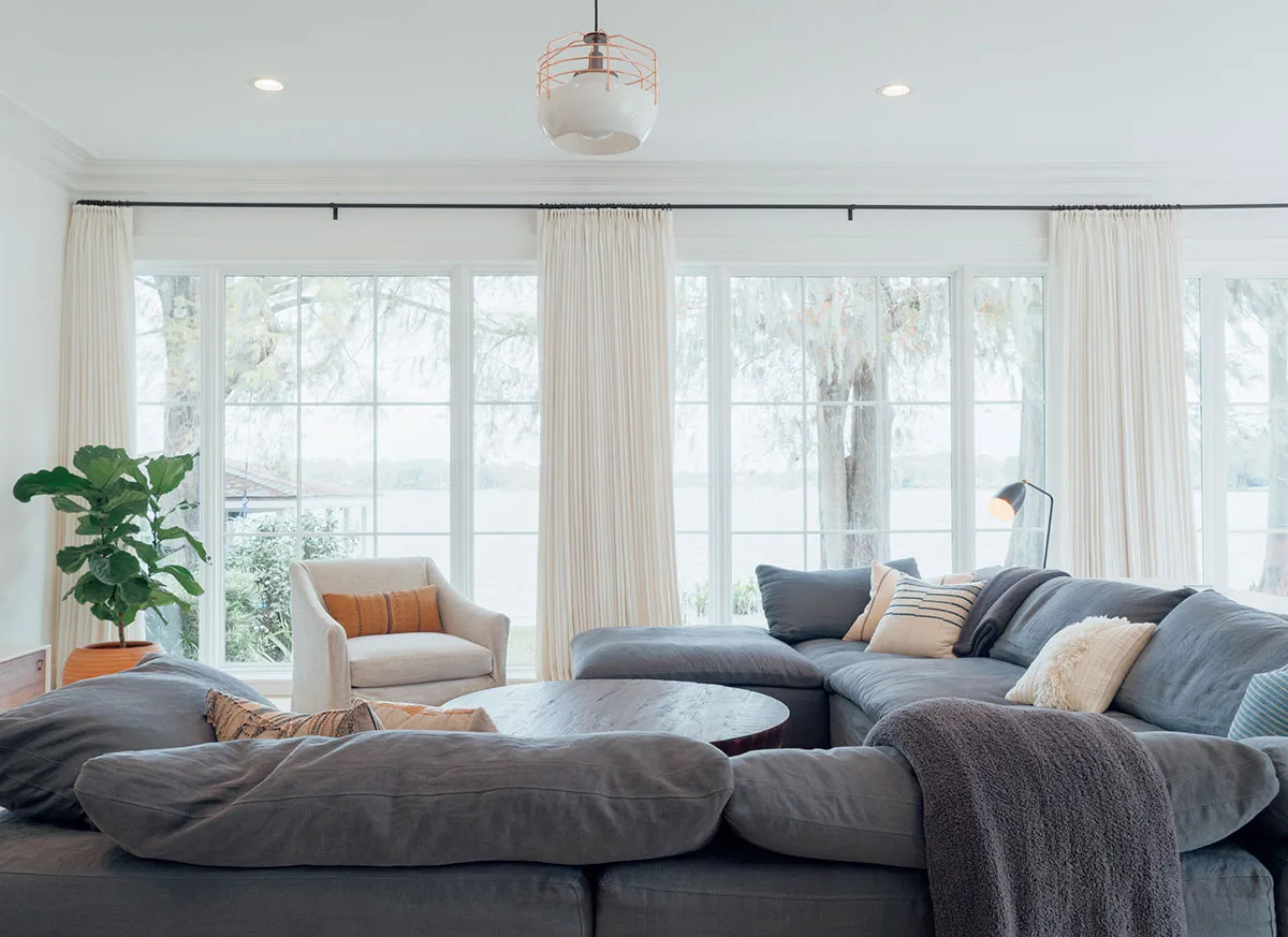 Sala de estar aireada y dormitorios con papel pintado: casa bonita al lado del lago en Florida