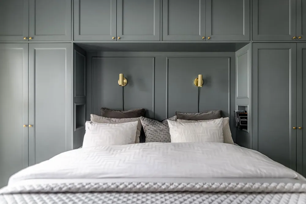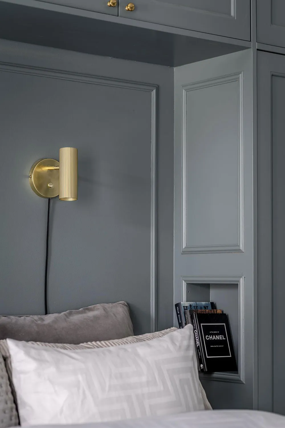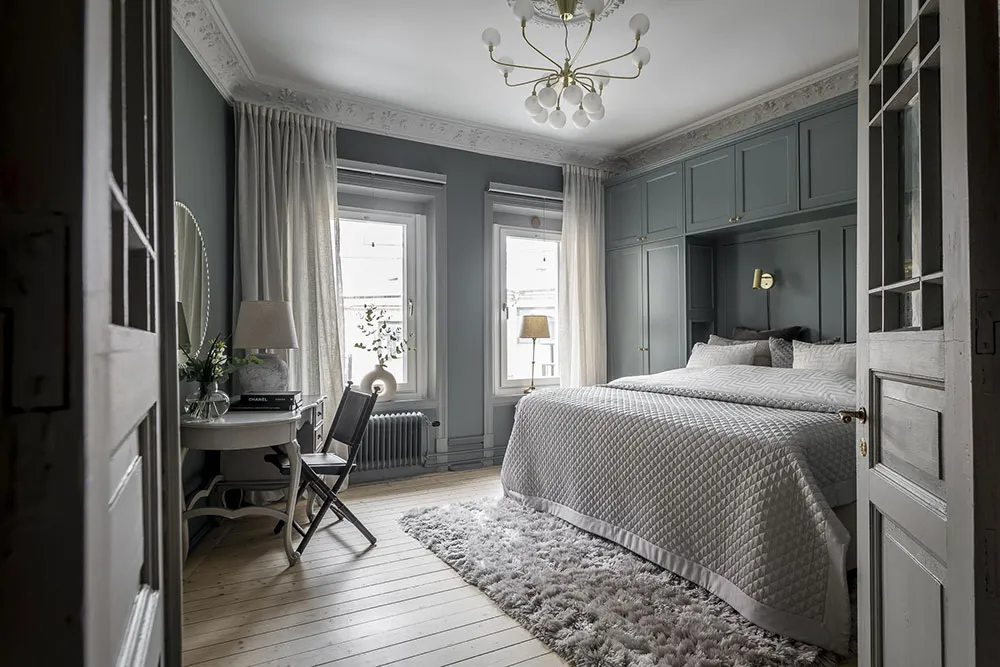 Paredes azules, dormitorio en nicho, puertas vintage: interesante estudio en Suecia (34 m²)