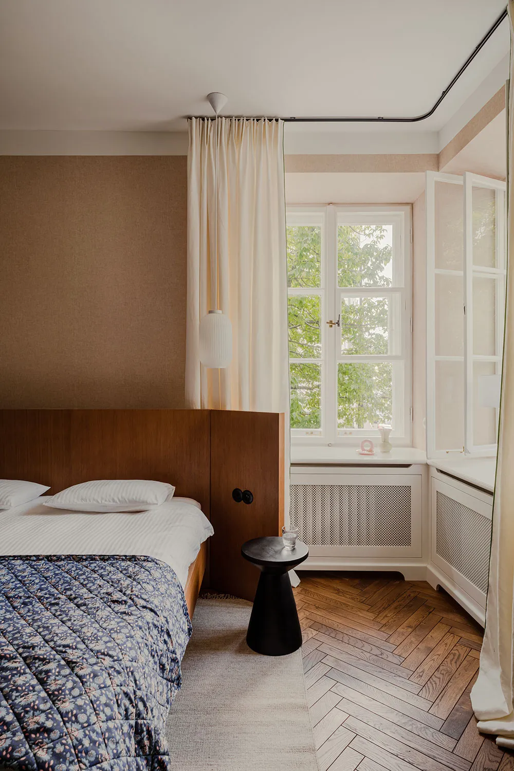 Paredes azules, dormitorio en nicho, puertas vintage: interesante estudio en Suecia (34 m²)