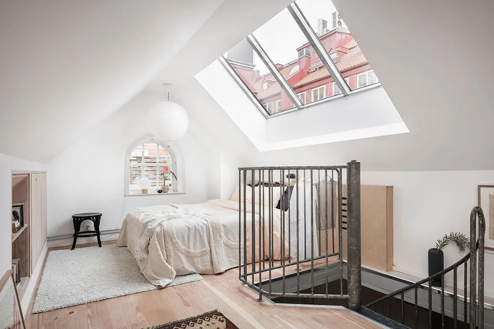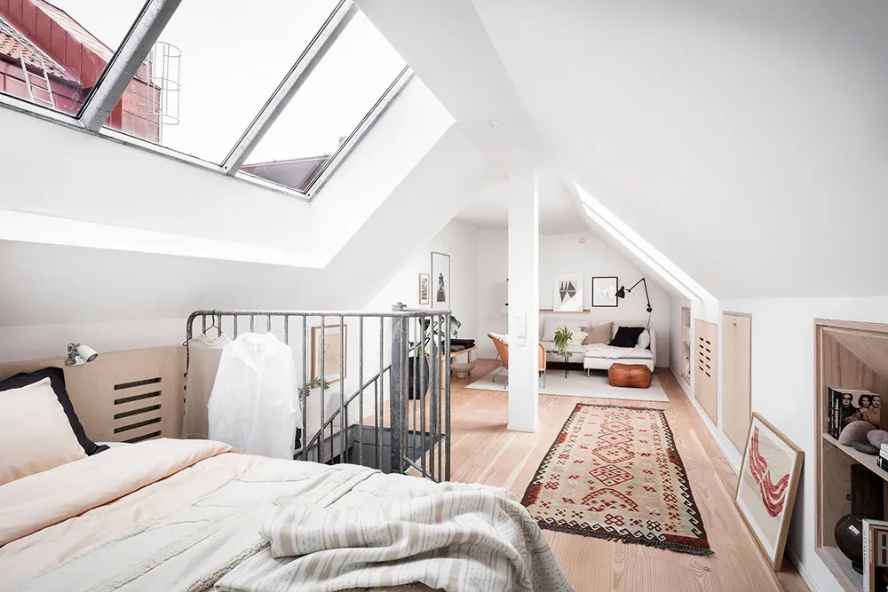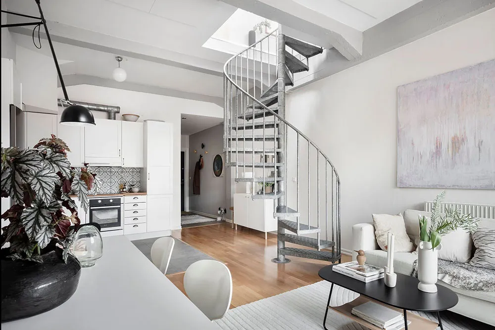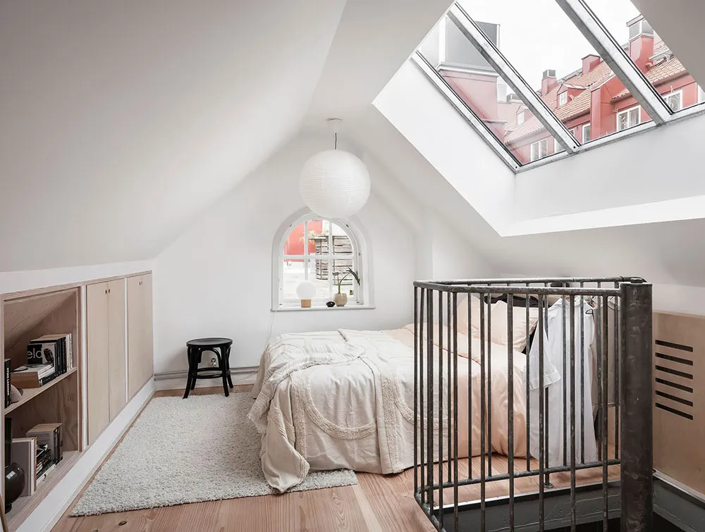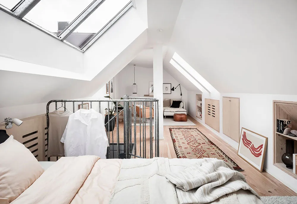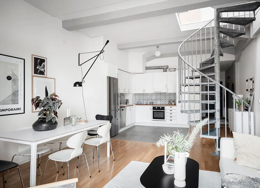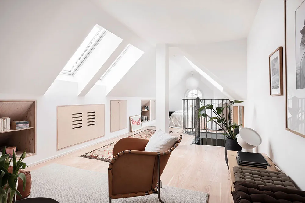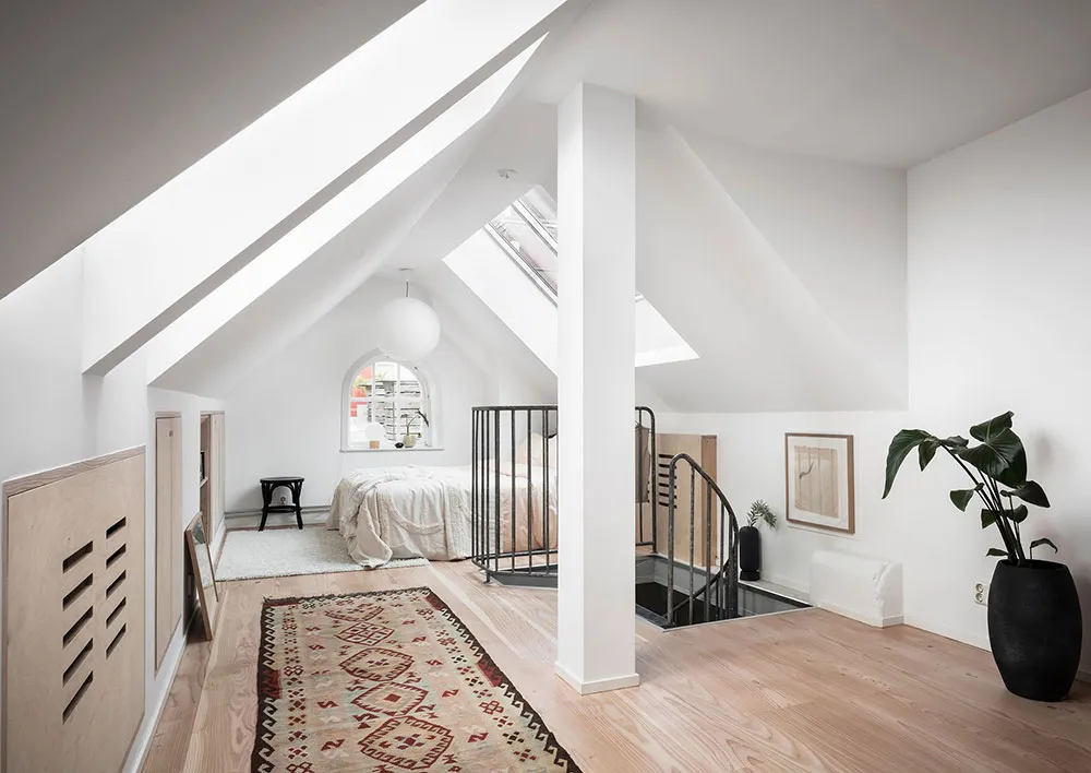 Este apartamento en Gotemburgo se distribuye de forma compacta en dos niveles, siendo el superior el que queda bajo el techo con ventanas de ático en el techo.