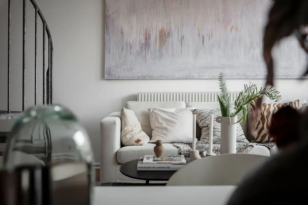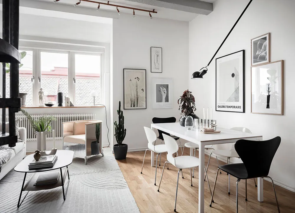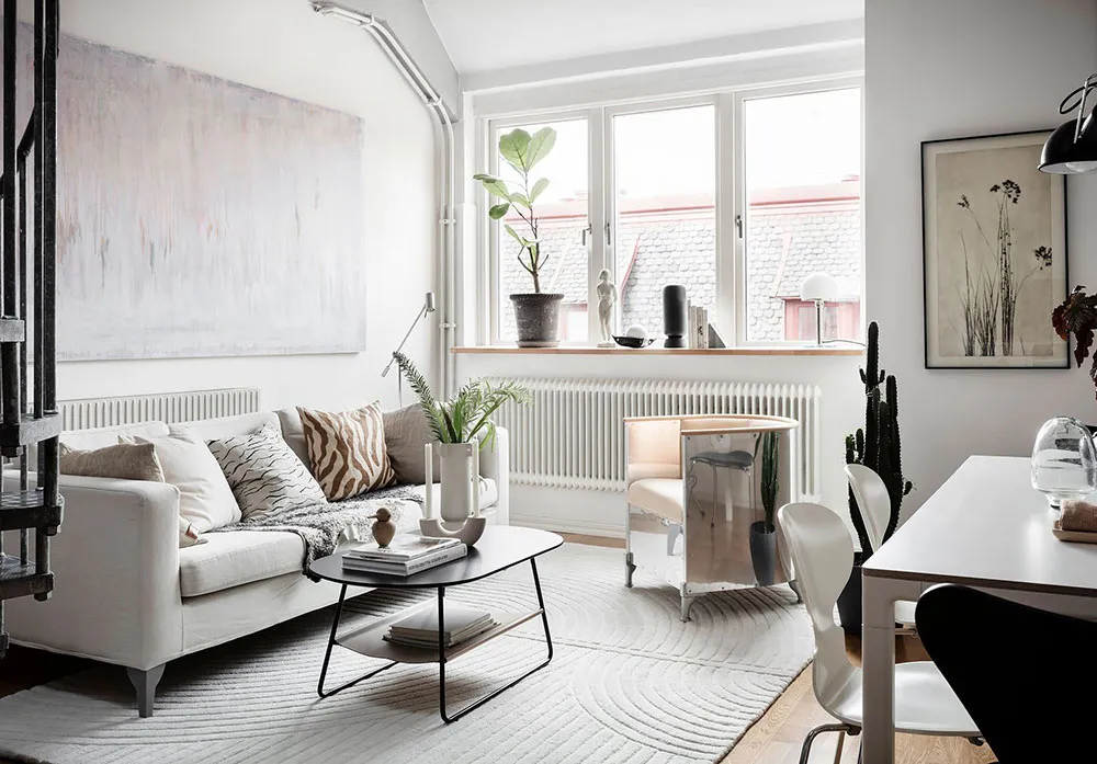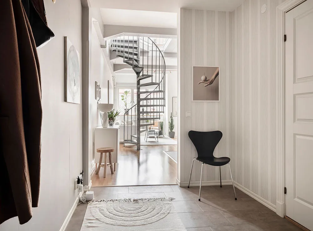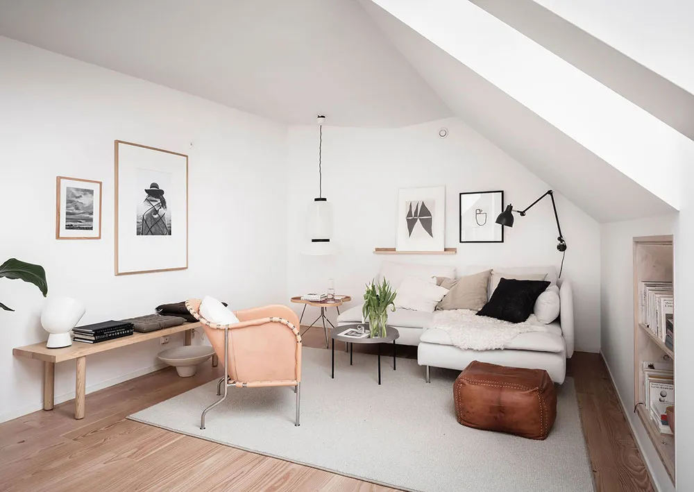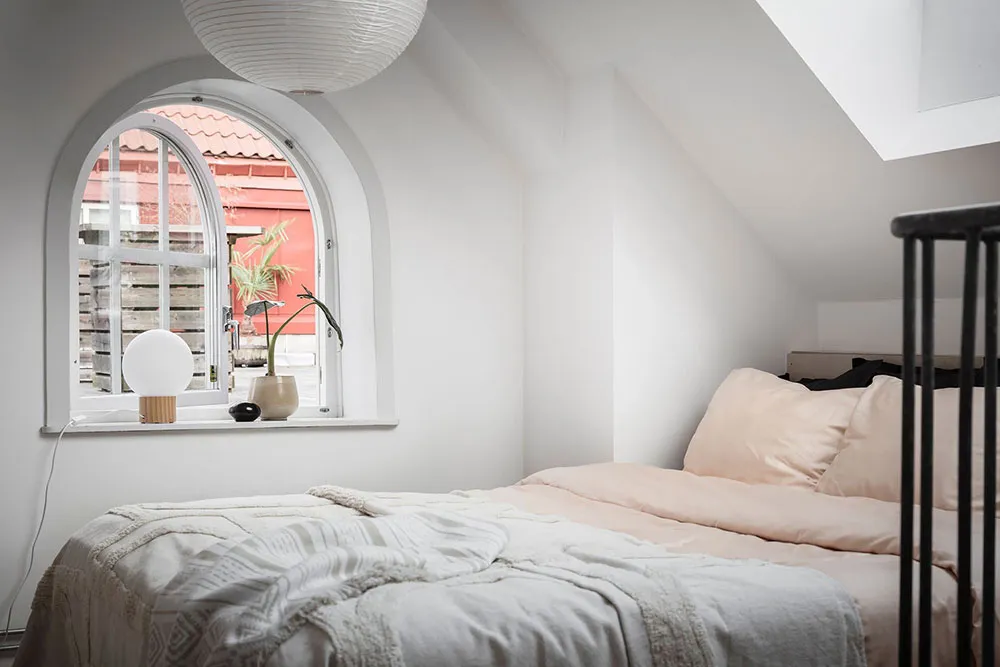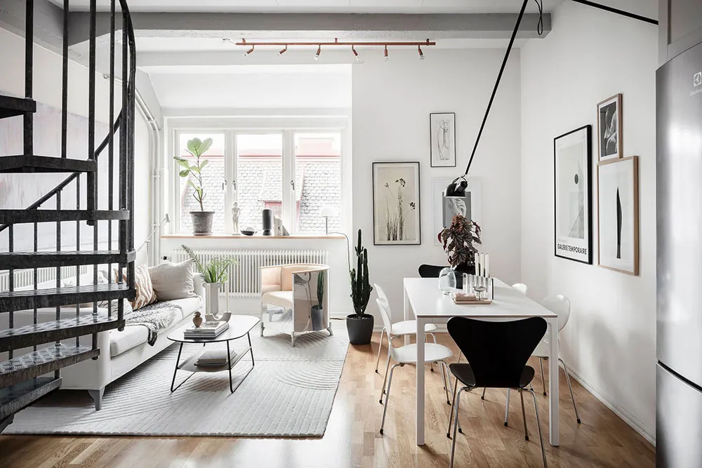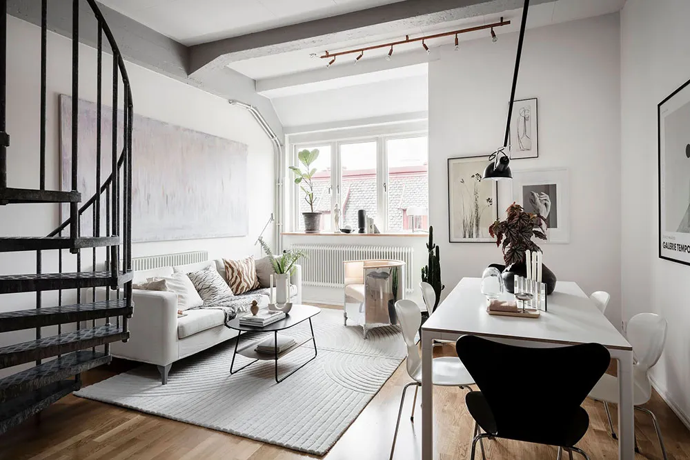 Este apartamento en Gotemburgo se distribuye de forma compacta en dos niveles, siendo el superior el que queda bajo el techo con ventanas de ático en el techo.