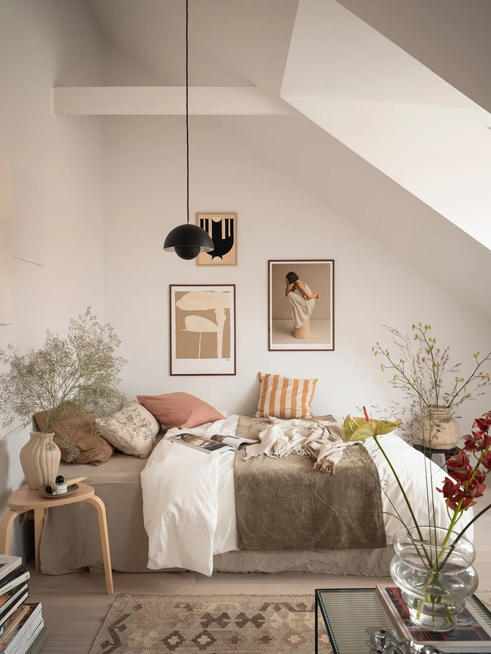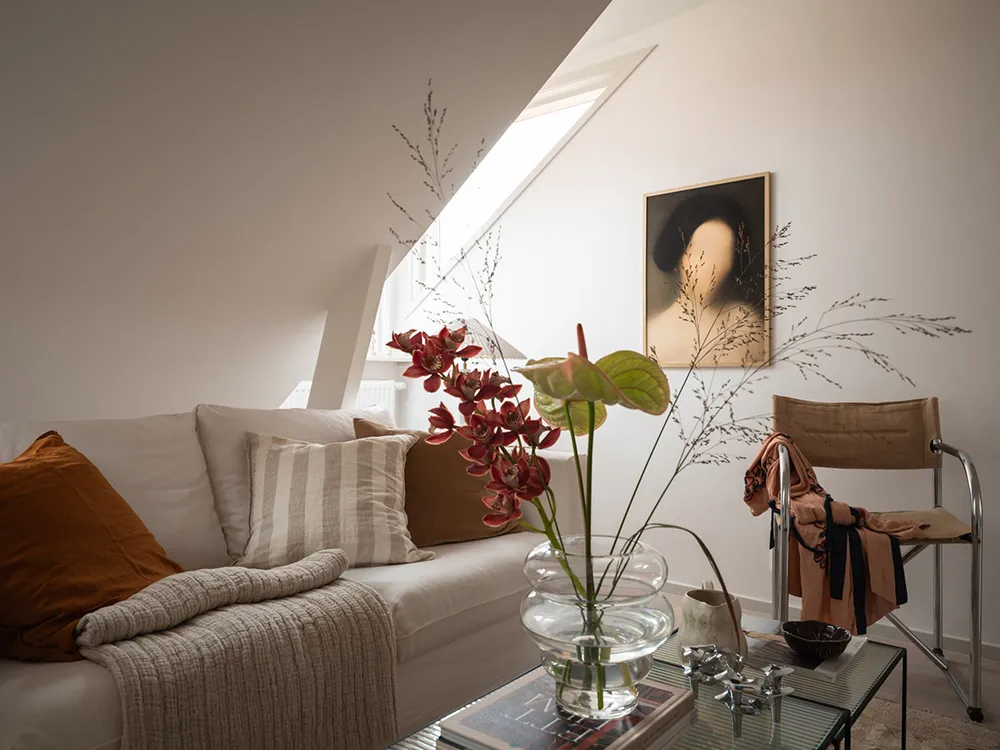 Pequeña mansarda con diseño abierto y decoración cálida (35 m²)