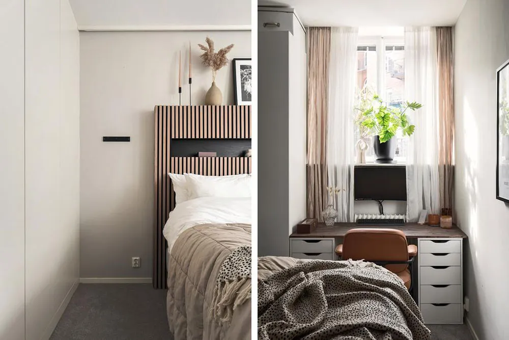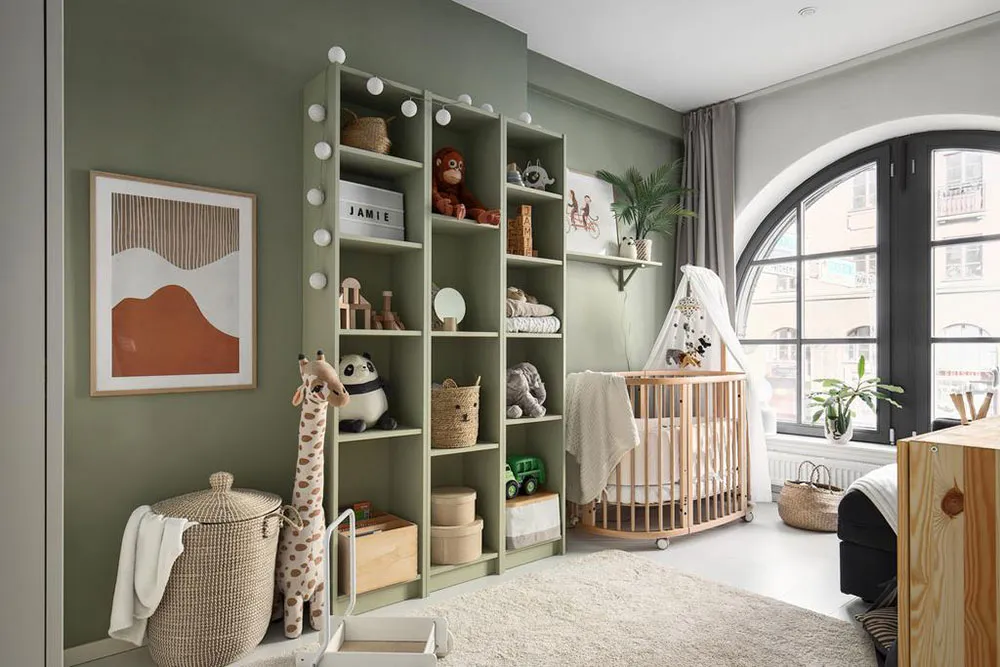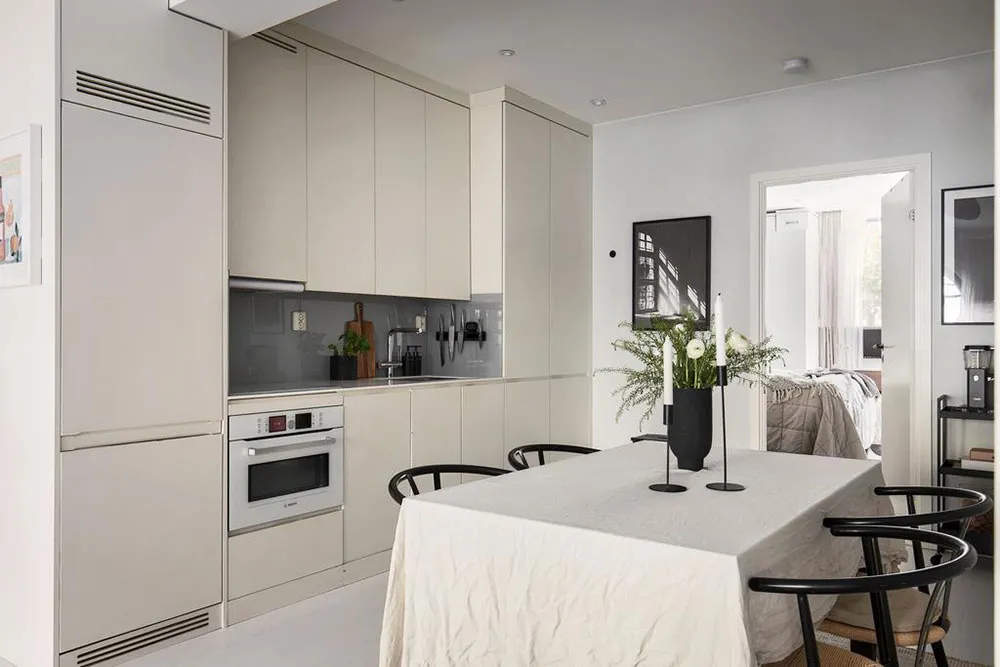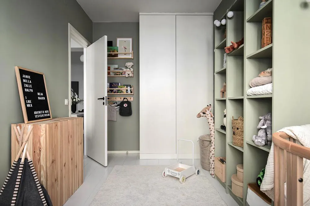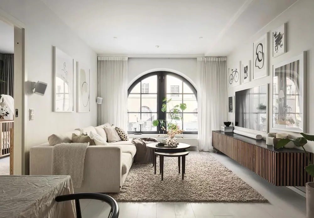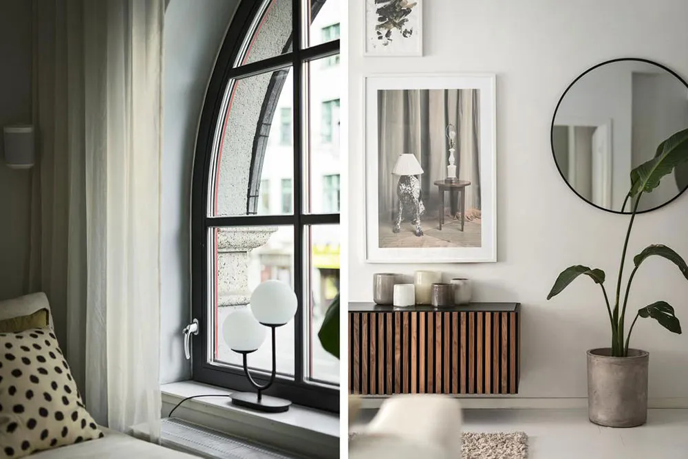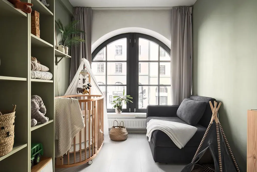 Este apartamento en Estocolmo no puede presumir de habitaciones espaciosas, pero sí tiene su punto distintivo: dos grandes ventanas arqueadas en la sala de estar y el dormitorio infantil.