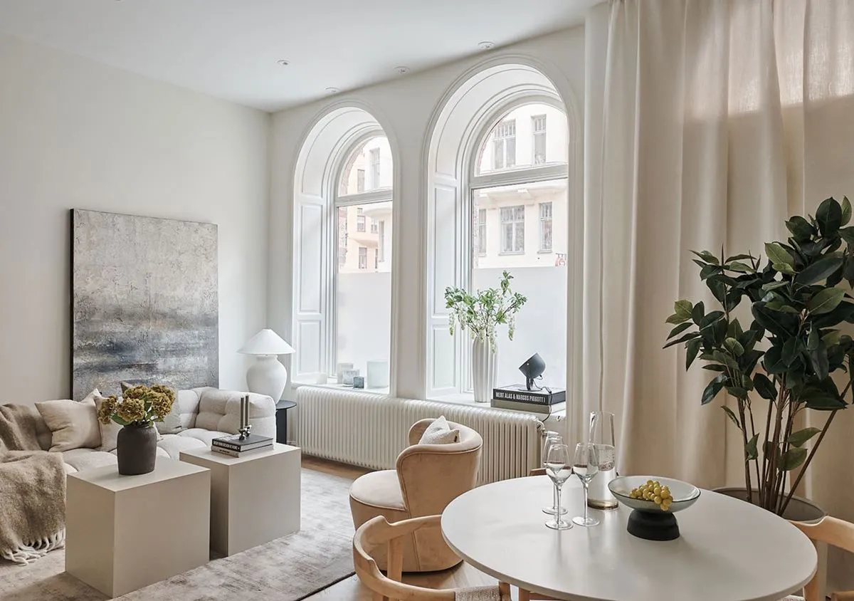 Ventanas arched, techos altos y espacio abierto: una estudia cálida en Estocolmo (42 m²)