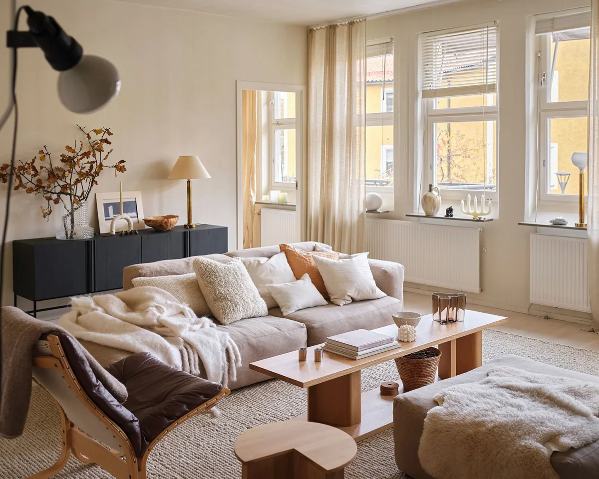 Interior escandinavo tranquilo con sofá blanco (66 m²)