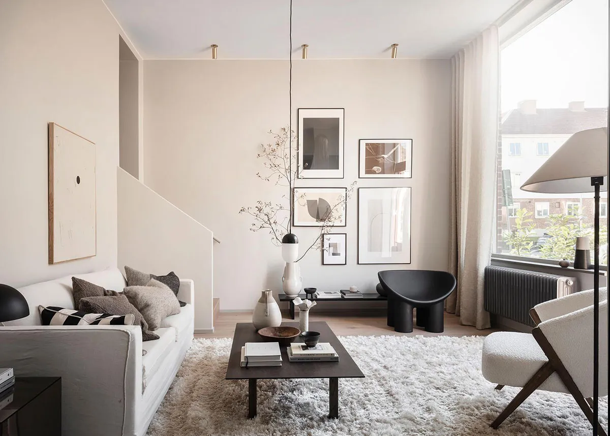 Interior tranquilo y suave de una pequeña casa de dos pisos en Suecia (72 m²)
