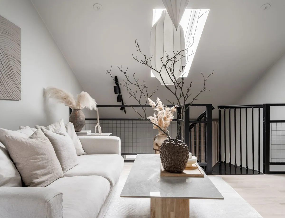 Interior tranquilo y suave de una pequeña casa de dos pisos en Suecia (72 m²)