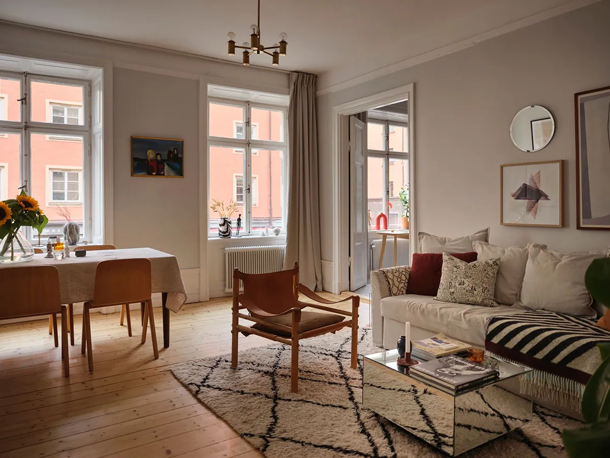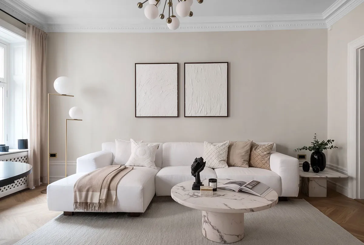 Paredes beige y decoración elegante en una casa sueca (71 m²)