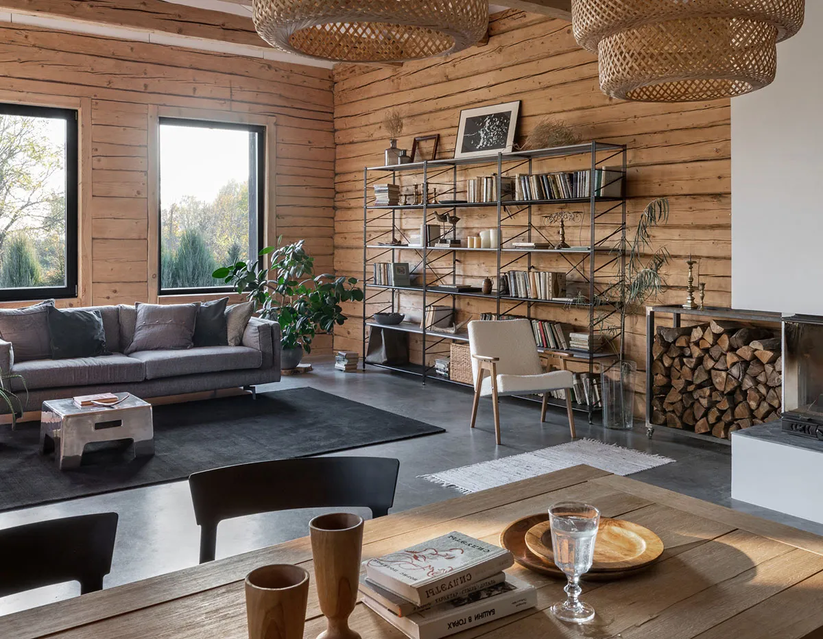 Antiguo cobertizo de troncos en una elegante envoltura moderna cerca de Minsk
