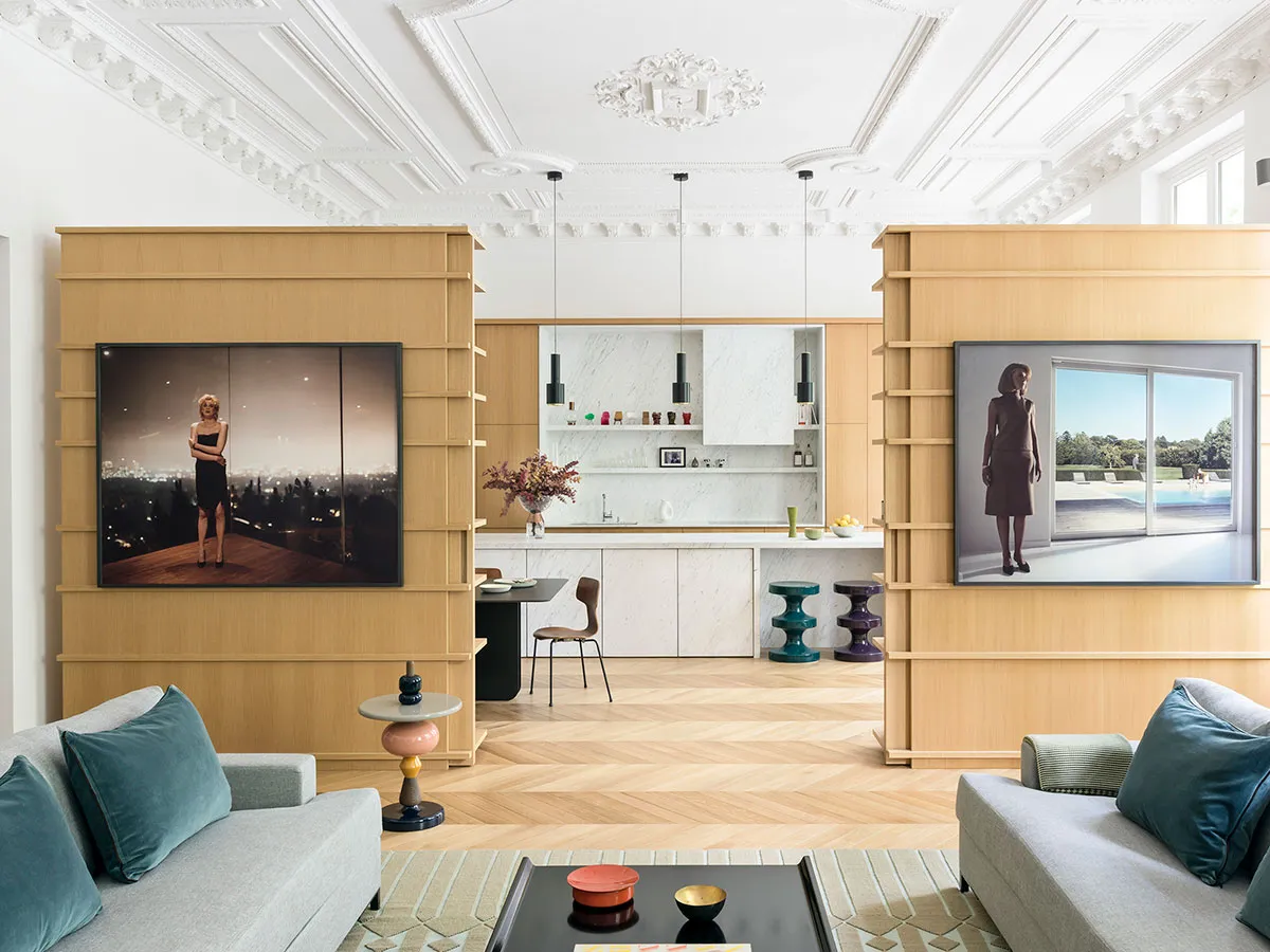 Diseño de interiores parisino elegante con abundancia de madera