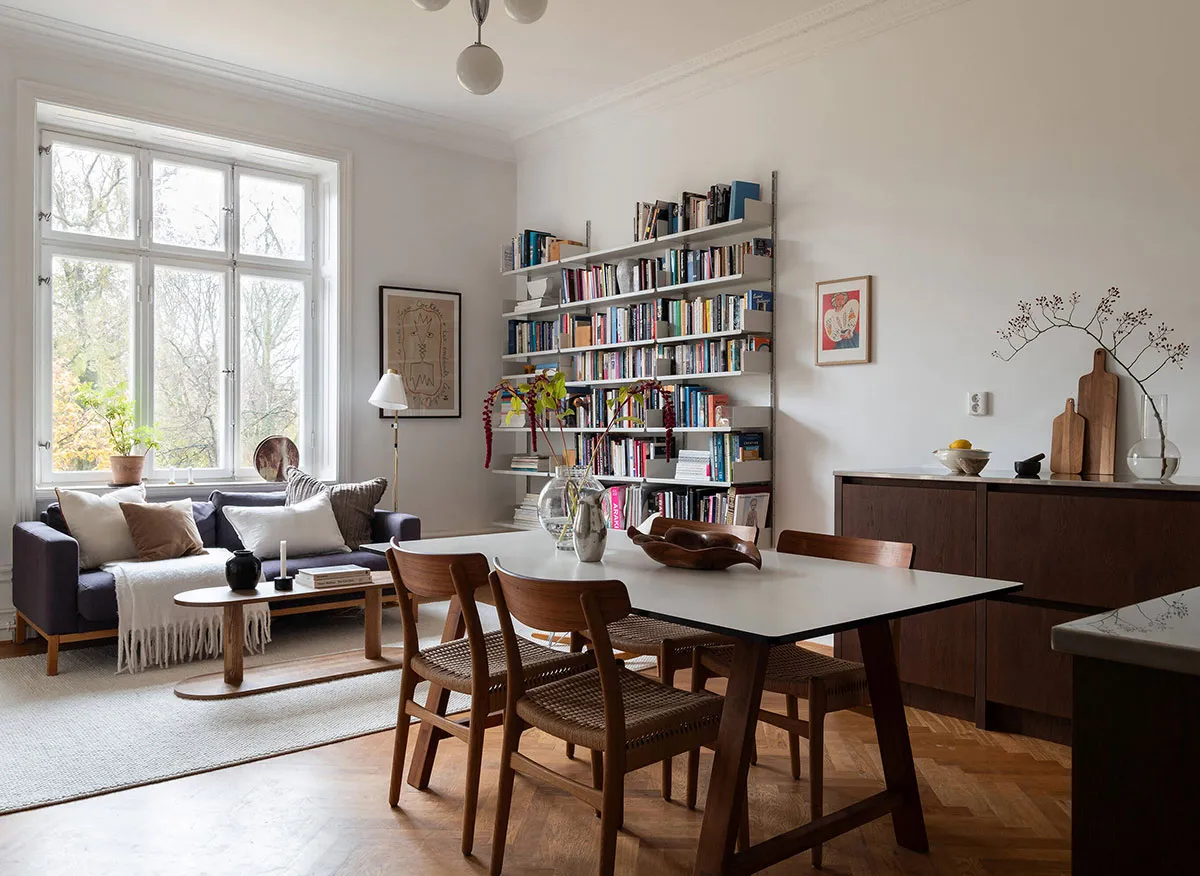 Interior escandinavo agradable con biblioteca y cocina abierta